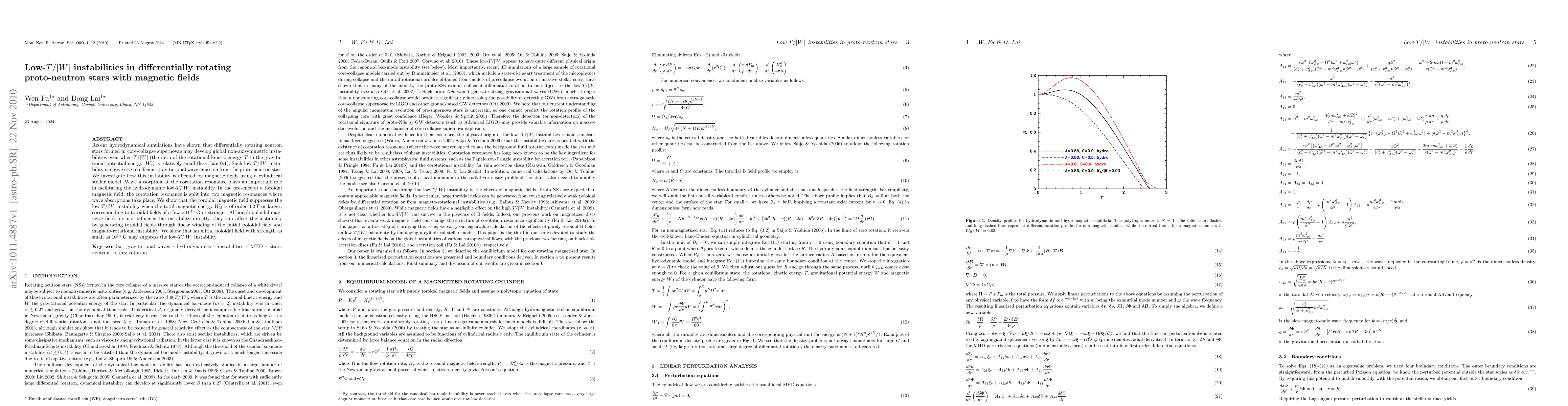 The work extends previous studies by explicitly examining the role of magnetic fields in low-$T/|W|$ instabilities, revealing that toroidal fields can suppress the instability while poloidal fields indirectly influence it through toroidal field generation.