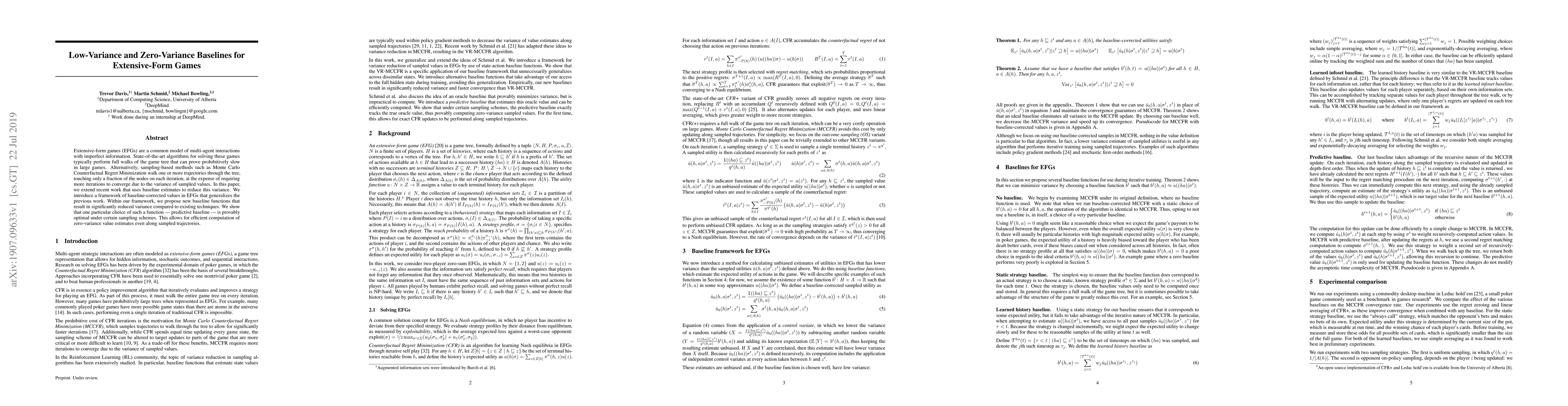 This paper proposes new baseline functions for extensive-form games that significantly reduce variance in value estimates compared to existing methods. The predictive baseline is shown to be optimal under certain sampling schemes, enabling efficient zero-variance value computations.