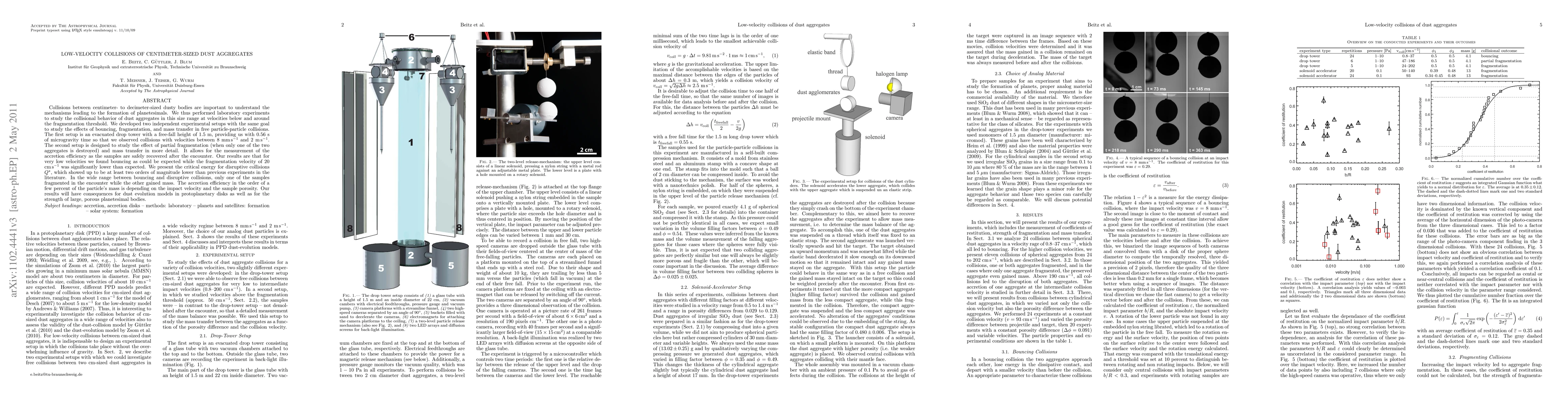 Scientists studied low-velocity collisions of centimeter-sized dust aggregates to understand planetesimal formation, finding critical collision energies lower than expected and accretion efficiencies varying with impact velocity and sample porosity.