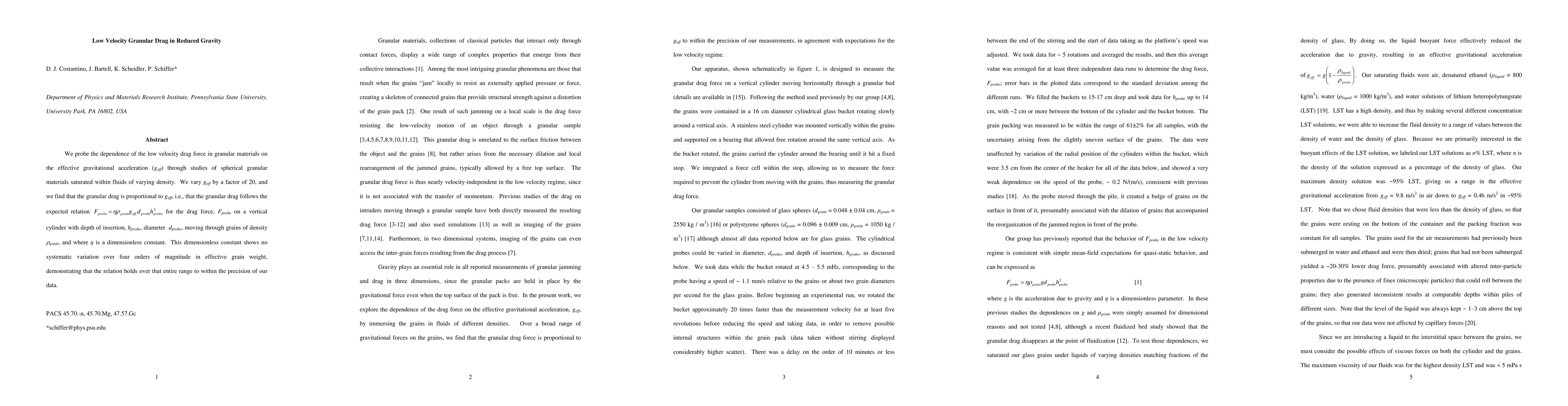 This study investigates the relationship between low velocity drag force in granular materials and effective gravitational acceleration, finding that the drag force is proportional to geff. The results confirm the expected relation for drag force on a vertical cylinder through granular materials, with a dimensionless constant showing no variation over four orders of magnitude in effective grain weight.