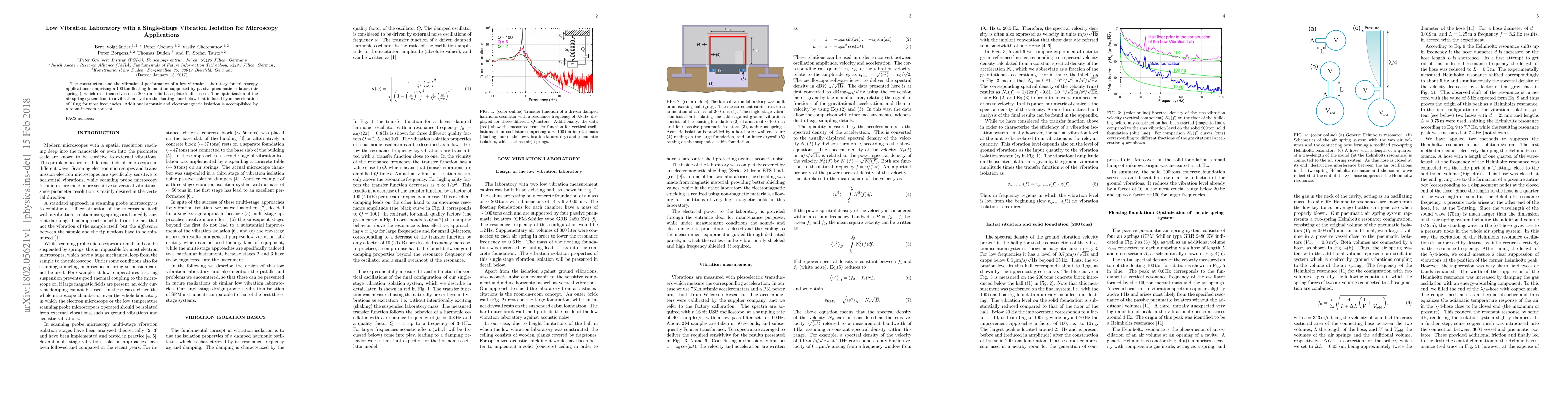 The paper details the design, optimization, and performance evaluation of a single-stage passive vibration isolation system for low vibration laboratories, incorporating a room-in-room concept for acoustic and electromagnetic shielding.