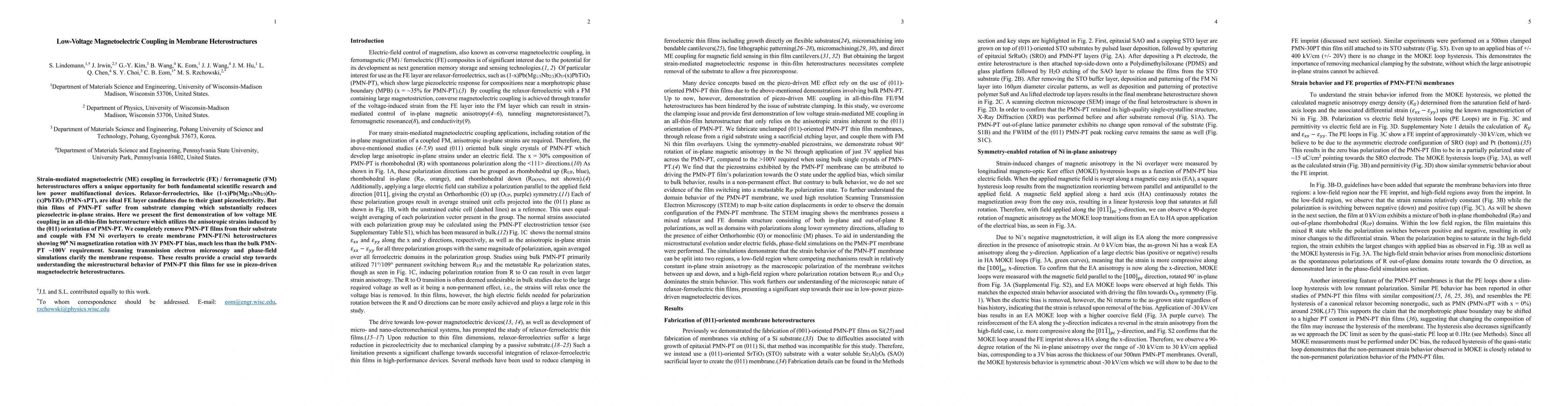 This paper demonstrates low-voltage magnetoelectric coupling in membrane heterostructures using PMN-PT/Ni, achieving 90-degree magnetization rotation with only 3V bias. The study addresses the challenge of substrate clamping in PMN-PT thin films, paving the way for low-power multifunctional devices.