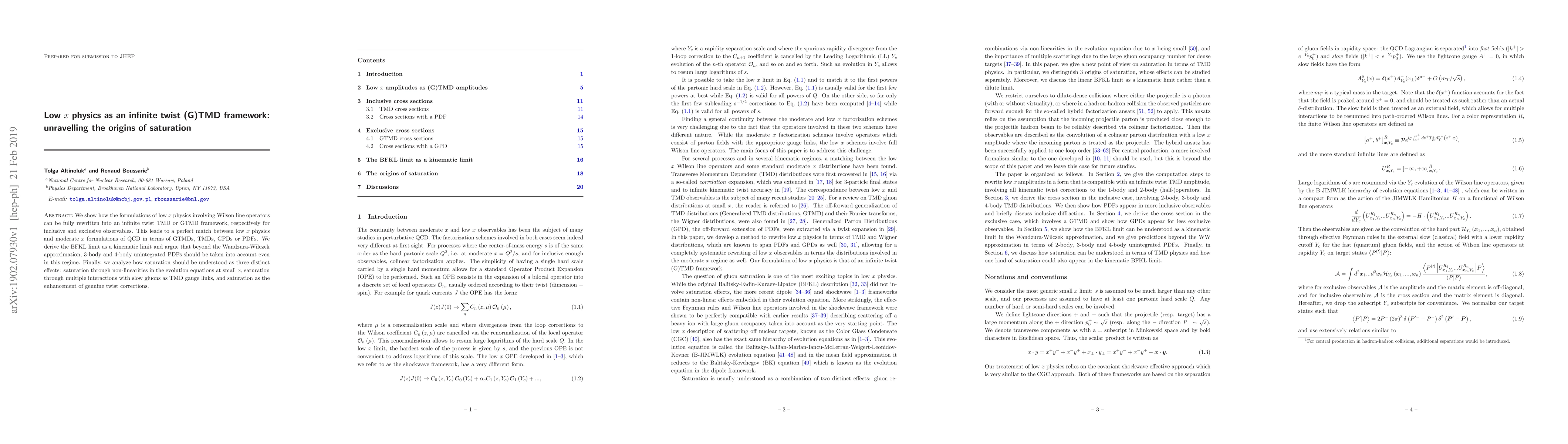We show how the formulations of low $x$ physics involving Wilson line operators can be fully rewritten into an infinite twist TMD or GTMD framework, respectively for inclusive and exclusive observables. This leads to a perfect match between low $x$ physics and moderate $x$ formulations of QCD in terms of GTMDs, TMDs, GPDs or PDFs. We derive the BFKL limit as a kinematic limit and argue that beyond the Wandzura-Wilczek approximation, 3-body and 4-body unintegrated PDFs should be taken into account even in this regime. Finally, we analyze how saturation should be understood as three distinct effects: saturation through non-linearities in the evolution equations at small $x$, saturation through multiple interactions with slow gluons as TMD gauge links, and saturation as the enhancement of genuine twist corrections.