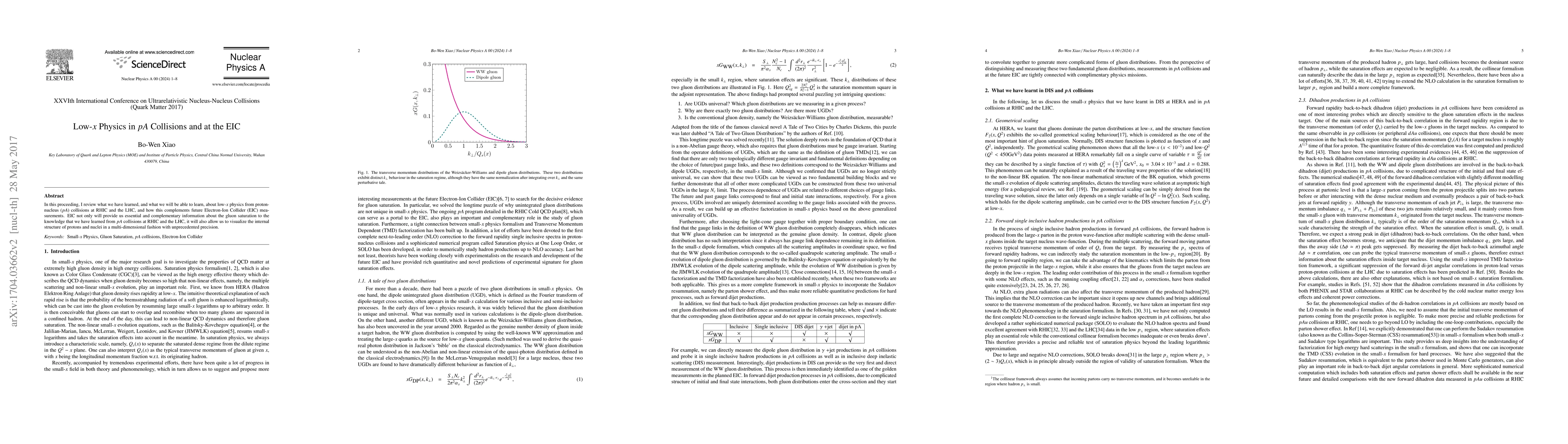 In this proceeding, I review what we have learned, and what we will be able to learn, about low-$x$ physics from proton-nucleus ($pA$) collisions at RHIC and the LHC, and how this complements future Electron-Ion Collider (EIC) measurements. EIC not only will provide us essential and complementary information about the gluon saturation to the knowledge that we have learned from $pA$ collisions at RHIC and the LHC, it will also allow us to visualize the internal structure of protons and nuclei in a multi-dimensional fashion with unprecedented precision.