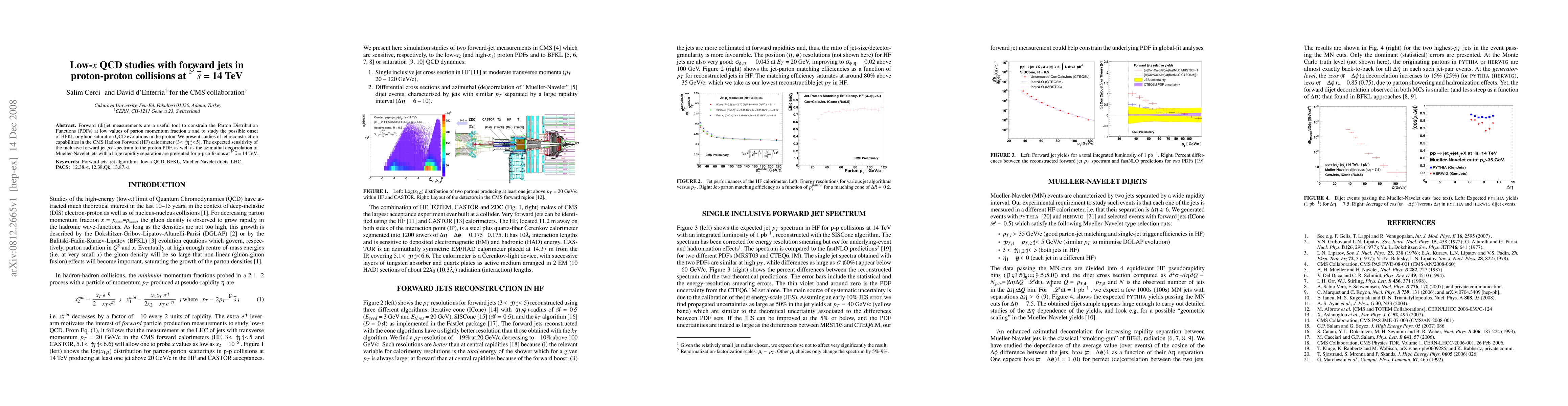 This paper investigates forward (di)jet measurements in proton-proton collisions at 14 TeV to constrain Parton Distribution Functions at low x and explore BFKL or gluon saturation QCD evolutions. It details the CMS Hadron Forward calorimeter's jet reconstruction capabilities and analyzes the sensitivity of the forward jet p_T spectrum to proton PDFs.