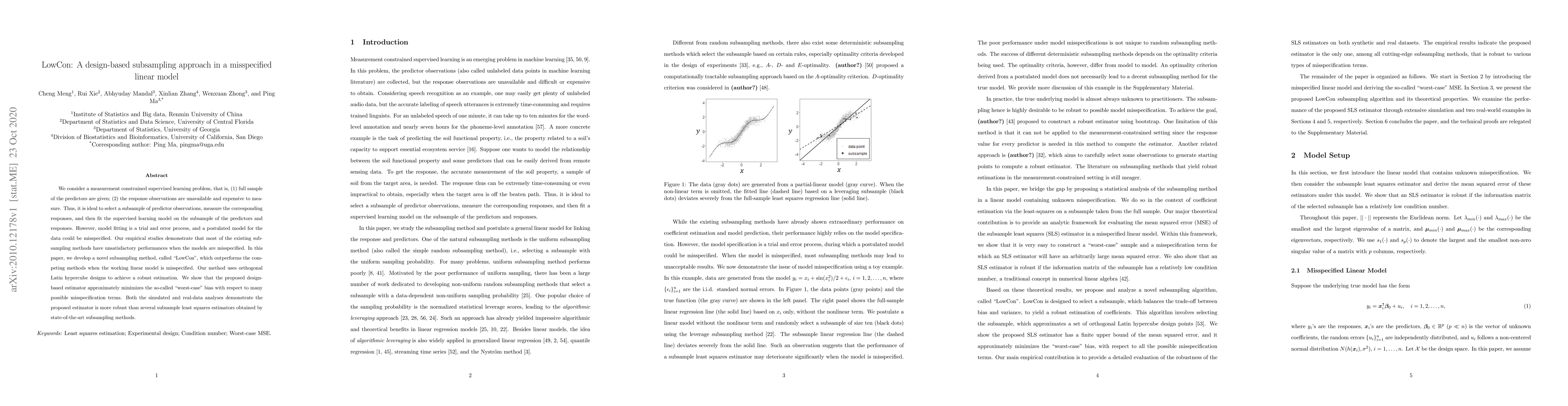 This paper introduces LowCon, a novel subsampling method for supervised learning in misspecified linear models, which uses orthogonal Latin hypercube designs to achieve robust estimation and outperforms existing methods in scenarios where model misspecification is present. The proposed method minimizes "worst-case" bias and demonstrates superior performance in both simulated and real-data analyses.