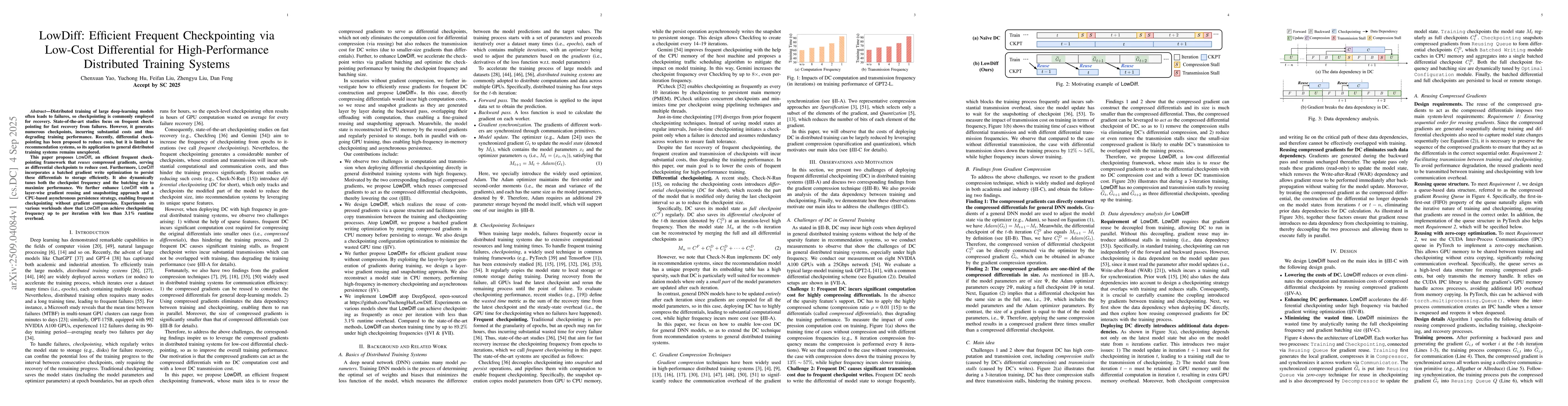 Distributed training of large deep-learning models often leads to failures, so checkpointing is commonly employed for recovery. State-of-the-art studies focus on frequent checkpointing for fast recovery from failures. However, it generates numerous checkpoints, incurring substantial costs and thus degrading training performance. Recently, differential checkpointing has been proposed to reduce costs, but it is limited to recommendation systems, so its application to general distributed training systems remains unexplored. This paper proposes LowDiff, an efficient frequent checkpointing framework that \textit{reuses} compressed gradients, serving as differential checkpoints to reduce cost. Furthermore, LowDiff incorporates a batched gradient write optimization to persist these differentials to storage efficiently. It also dynamically tunes both the checkpoint frequency and the batching size to maximize performance. We further enhance LowDiff with a layer-wise gradient reusing and snapshotting approach and a CPU-based asynchronous persistence strategy, enabling frequent checkpointing without gradient compression. Experiments on various workloads show that LowDiff can achieve checkpointing frequency up to per iteration with less than 3.1\% runtime overhead.