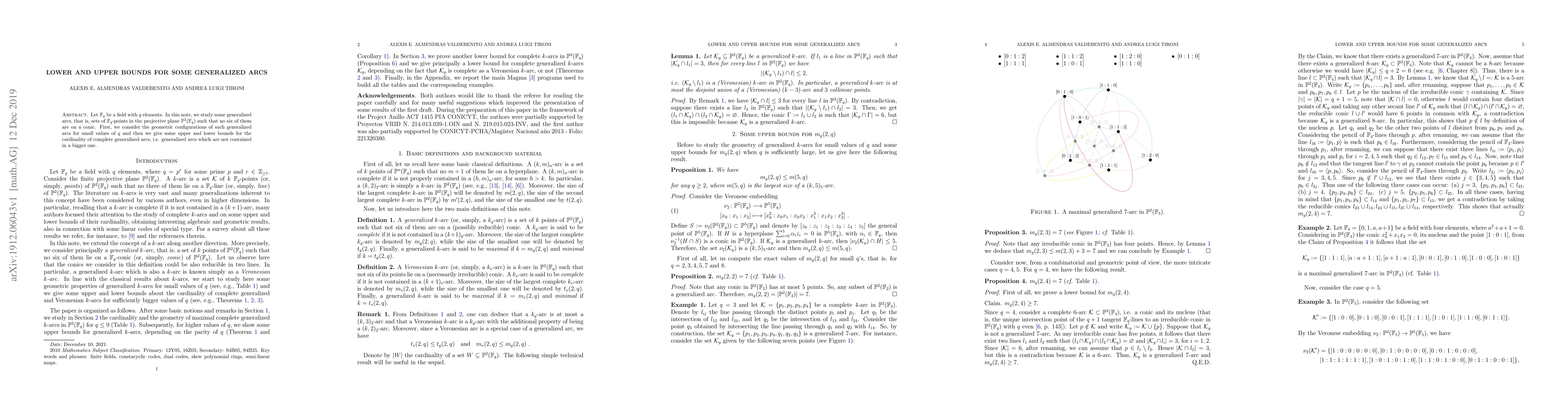 Let $\mathbb{F}_q$ be a field with $q$ elements. In this note, we study some generalized arcs, that is, sets of $\mathbb{F}_q$-points in the projective plane $\mathbb{P}^2(\mathbb{F}_q)$ such that no six of them are on a conic. First, we consider the geometric configurations of such generalized arcs for small values of $q$ and then we give some upper and lower bounds for the cardinality of complete generalized arcs, i.e. generalized arcs which are not contained in a bigger one.