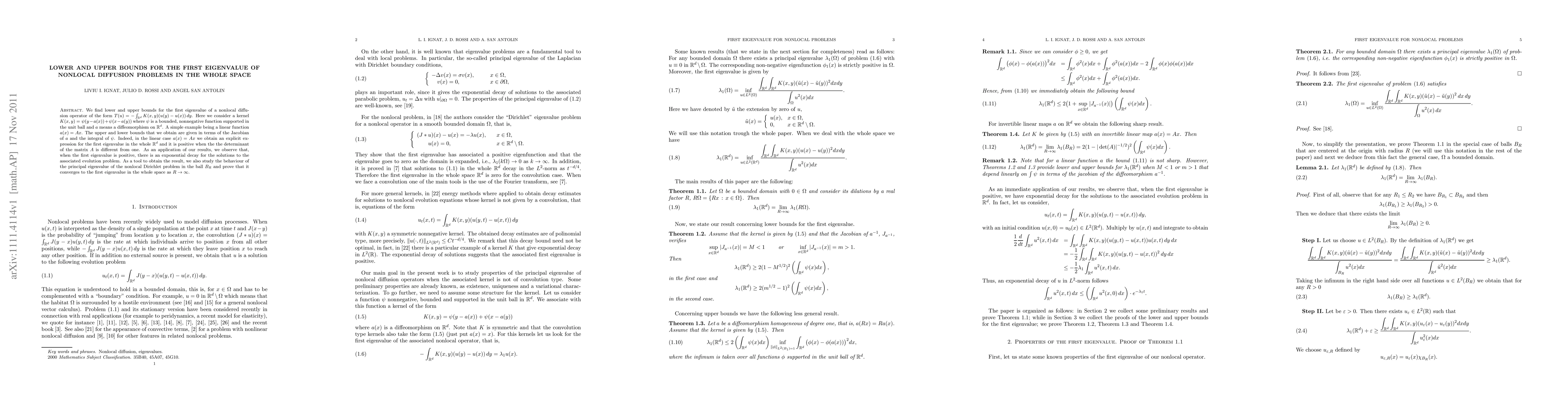 We find lower and upper bounds for the first eigenvalue of a nonlocal diffusion operator of the form $ T(u) = - \int_{\rr^d} K(x,y) (u(y)-u(x)) \, dy$. Here we consider a kernel $K(x,y)=\psi (y-a(x))+\psi(x-a(y))$ where $\psi$ is a bounded, nonnegative function supported in the unit ball and $a$ means a diffeomorphism on $\rr^d$. A simple example being a linear function $a(x)= Ax$. The upper and lower bounds that we obtain are given in terms of the Jacobian of $a$ and the integral of $\psi$. Indeed, in the linear case $a(x) = Ax$ we obtain an explicit expression for the first eigenvalue in the whole $\rr^d$ and it is positive when the the determinant of the matrix $A$ is different from one. As an application of our results, we observe that, when the first eigenvalue is positive, there is an exponential decay for the solutions to the associated evolution problem. As a tool to obtain the result, we also study the behaviour of the principal eigenvalue of the nonlocal Dirichlet problem in the ball $B_R$ and prove that it converges to the first eigenvalue in the whole space as $R\to \infty$.