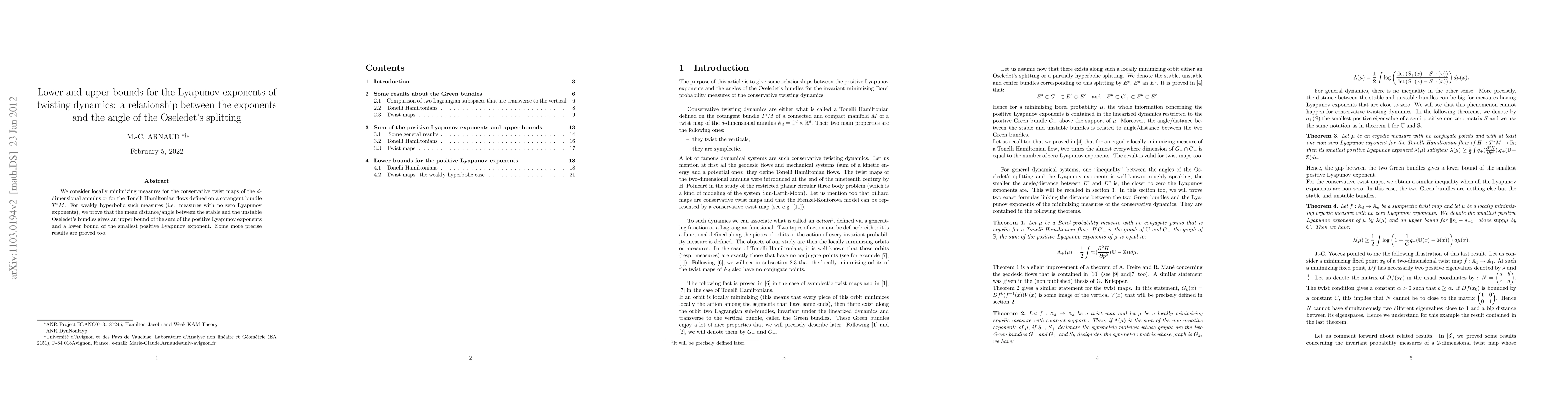 We consider locally minimizing measures for the conservative twist maps of the $d$-dimensional annulus or for the Tonelli Hamiltonian flows defined on a cotangent bundle $T^*M$. For weakly hyperbolic such measures (i.e. measures with no zero Lyapunov exponents), we prove that the mean distance/angle between the stable and the unstable Oseledet's bundles gives an upper bound of the sum of the positive Lyapunov exponents and a lower bound of the smallest positive Lyapunov exponent. Some more precise results are proved too.