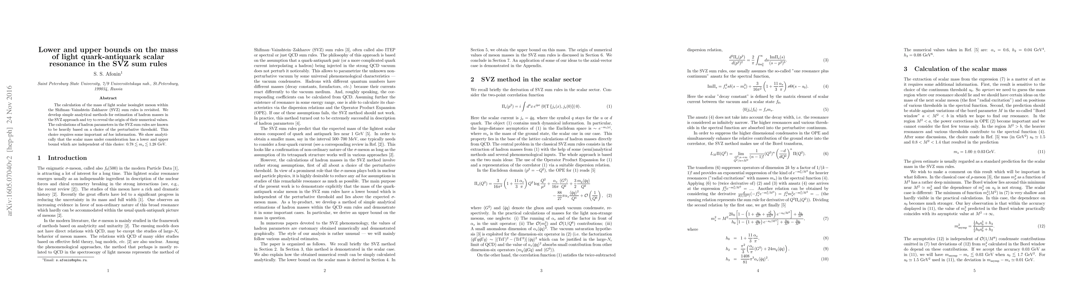 The calculation of the mass of light scalar isosinglet meson within the Shifman-Vainshtein-Zakharov (SVZ) sum rules is revisited. We develop simple analytical methods for estimation of hadron masses in the SVZ approach and try to reveal the origin of their numerical values. The calculations of hadron parameters in the SVZ sum rules are known to be heavily based on a choice of the perturbative threshold. This choice requires some important ad hoc information. We show analytically that the scalar mass under consideration has a lower and upper bound which are independent of this choice: $0.78\lesssim m_s\lesssim1.28$ GeV.