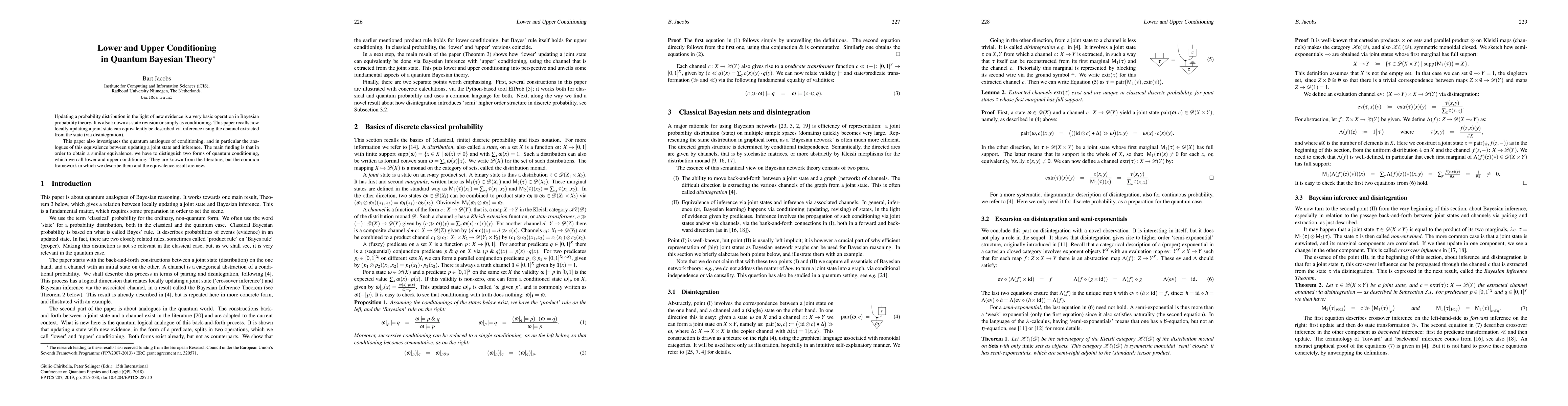 Updating a probability distribution in the light of new evidence is a very basic operation in Bayesian probability theory. It is also known as state revision or simply as conditioning. This paper recalls how locally updating a joint state can equivalently be described via inference using the channel extracted from the state (via disintegration). This paper also investigates the quantum analogues of conditioning, and in particular the analogues of this equivalence between updating a joint state and inference. The main finding is that in order to obtain a similar equivalence, we have to distinguish two forms of quantum conditioning, which we call lower and upper conditioning. They are known from the literature, but the common framework in which we describe them and the equivalence result are new.