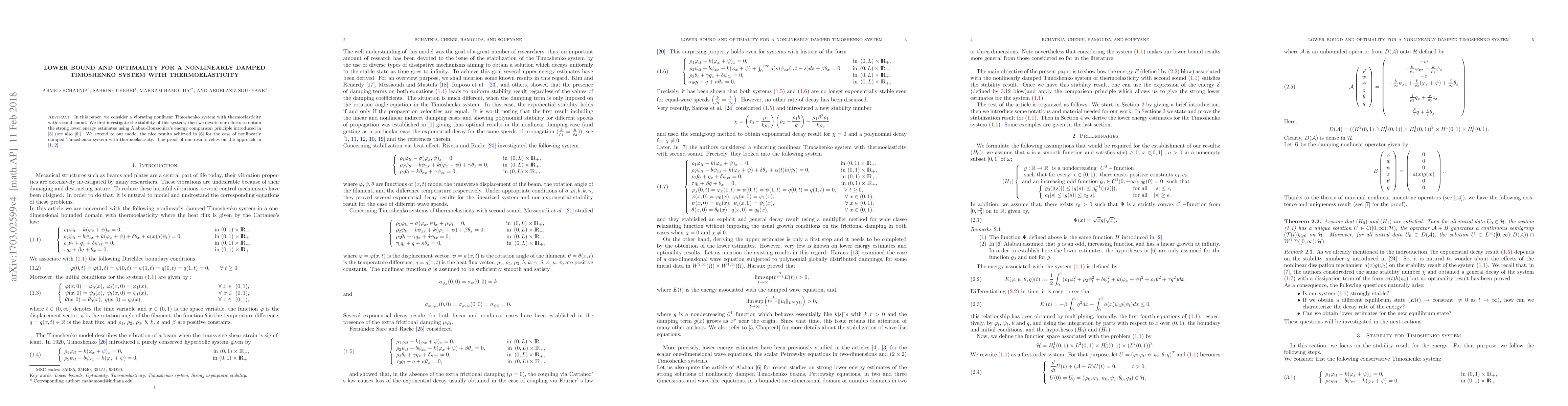 This paper investigates the strong stability and lower energy estimates for a nonlinearly damped Timoshenko system with thermoelasticity and second sound. The authors prove the optimality of the asymptotic results by extending Alabau--Boussouira's energy comparison principle and providing explicit examples of nonlinear damping terms.