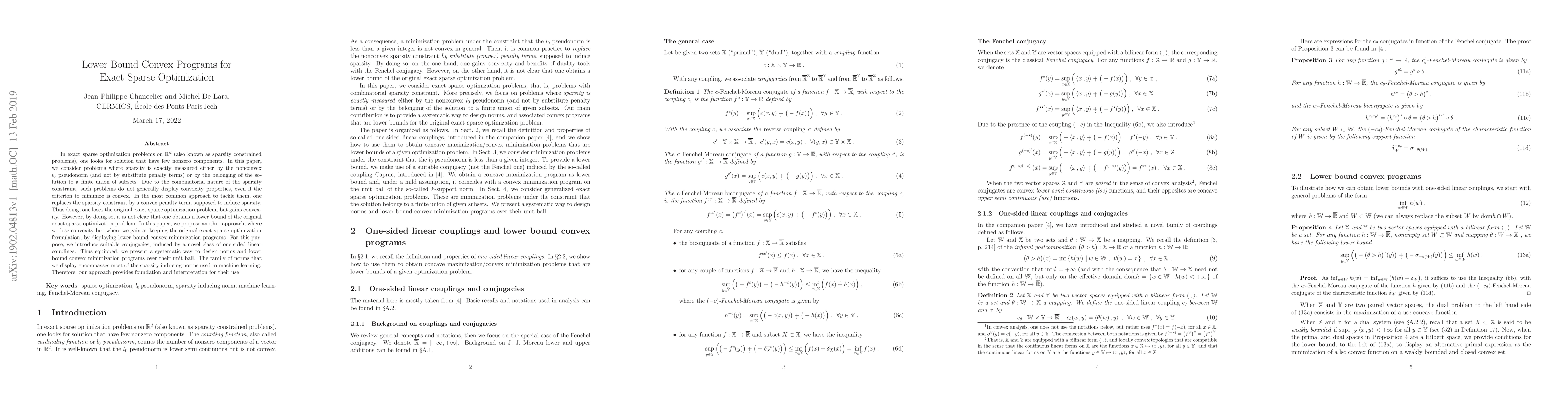 In exact sparse optimization problems on Rd (also known as sparsity constrained problems), one looks for solution that have few nonzero components. In this paper, we consider problems where sparsity is exactly measured either by the nonconvex l0 pseudonorm (and not by substitute penalty terms) or by the belonging of the solution to a finite union of subsets. Due to the combinatorial nature of the sparsity constraint, such problems do not generally display convexity properties, even if the criterion to minimize is convex. In the most common approach to tackle them, one replaces the sparsity constraint by a convex penalty term, supposed to induce sparsity. Thus doing, one loses the original exact sparse optimization problem, but gains convexity. However, by doing so, it is not clear that one obtains a lower bound of the original exact sparse optimization problem. In this paper, we propose another approach, where we lose convexity but where we gain at keeping the original exact sparse optimization formulation, by displaying lower bound convex minimization programs. For this purpose , we introduce suitable conjugacies, induced by a novel class of one-sided linear couplings. Thus equipped, we present a systematic way to design norms and lower bound convex minimization programs over their unit ball. The family of norms that we display encompasses most of the sparsity inducing norms used in machine learning. Therefore, our approach provides foundation and interpretation for their use.