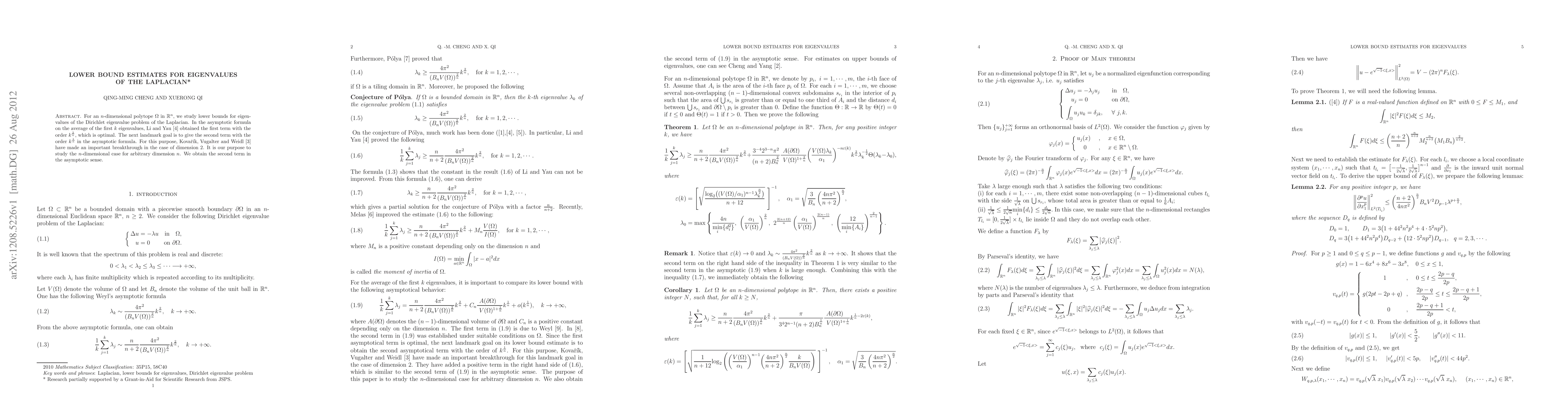 This paper investigates lower bounds for the eigenvalues of the Laplacian on $n$-dimensional polytopes, extending previous results by Li and Yau (1983) and Kovařík et al. (2009). The authors provide the second term in the asymptotic formula for the average of the first $k$ eigenvalues, achieving the optimal order $k^{\frac{1}{n}}$.