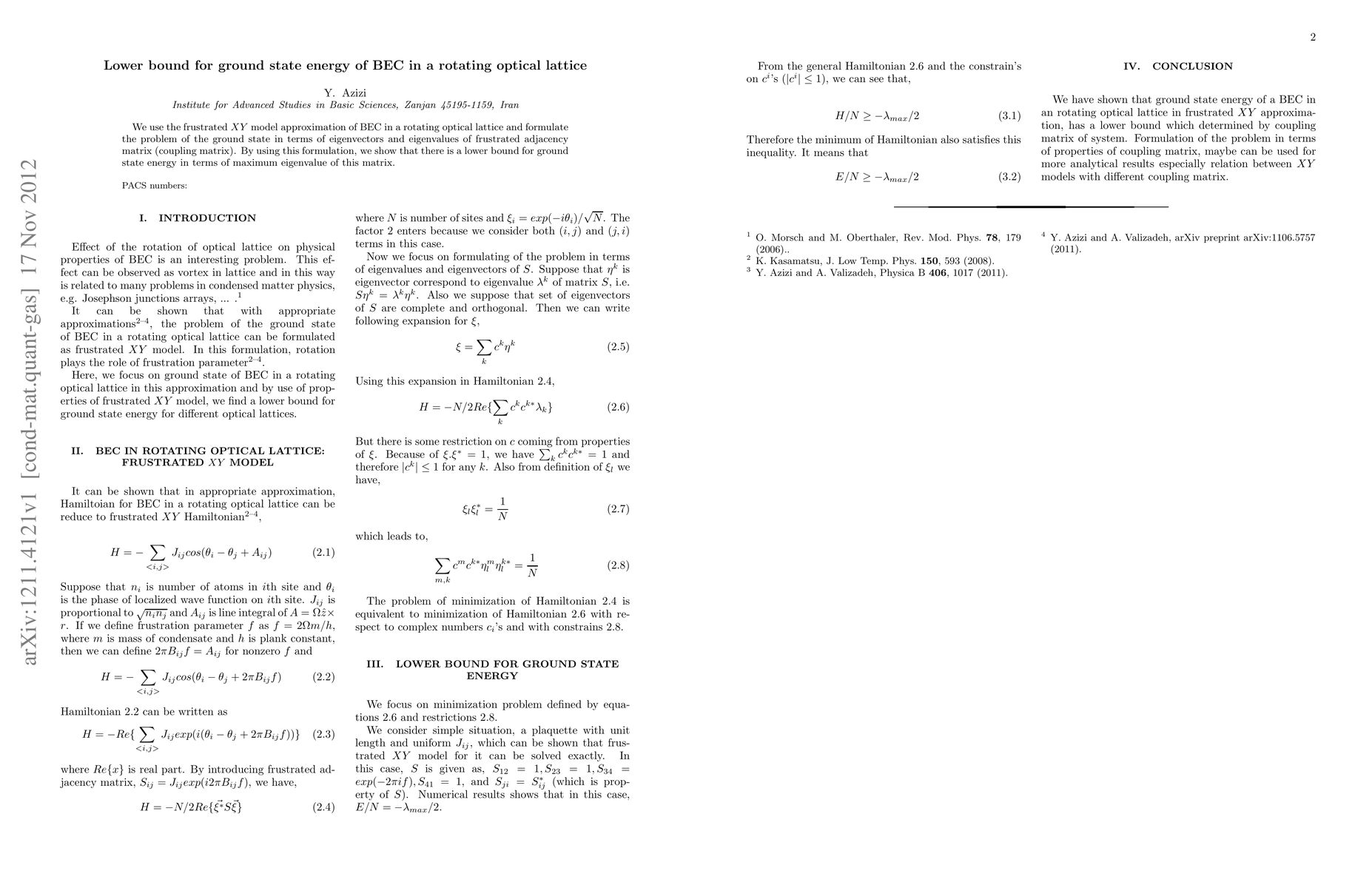 Summary: This paper establishes a lower bound for the ground state energy of a Bose-Einstein condensate (BEC) in a rotating optical lattice using the frustrated XY model. The authors demonstrate that the lower bound is determined by the maximum eigenvalue of a frustrated adjacency matrix.