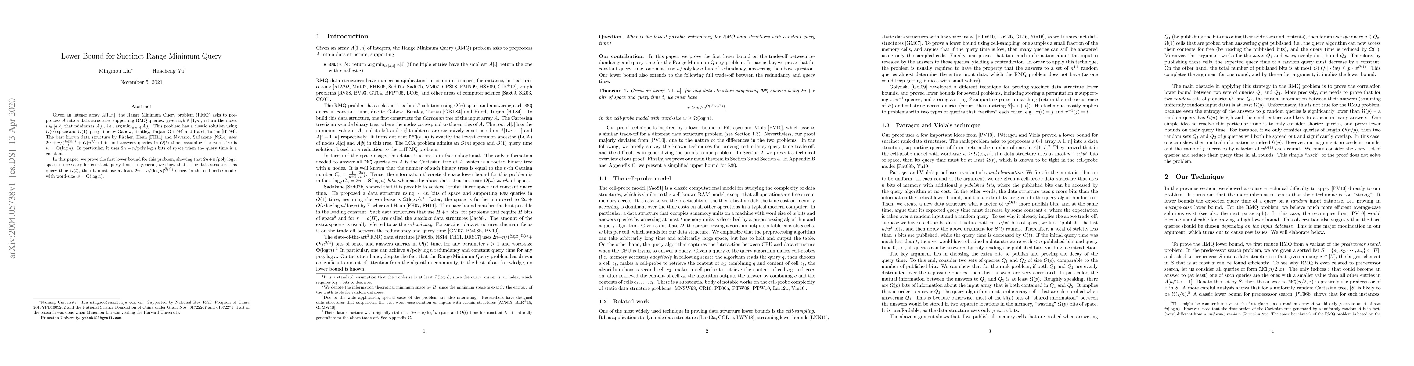 This paper establishes the first lower bound for the Range Minimum Query (RMQ) problem, proving that $2n+n/\mathrm{poly}\log n$ bits of space is necessary for constant query time. It also demonstrates that for query time $O(t)$, a data structure must use at least $2n+n/(\log n)^{\tilde{O}(t^2)}$ bits of space.