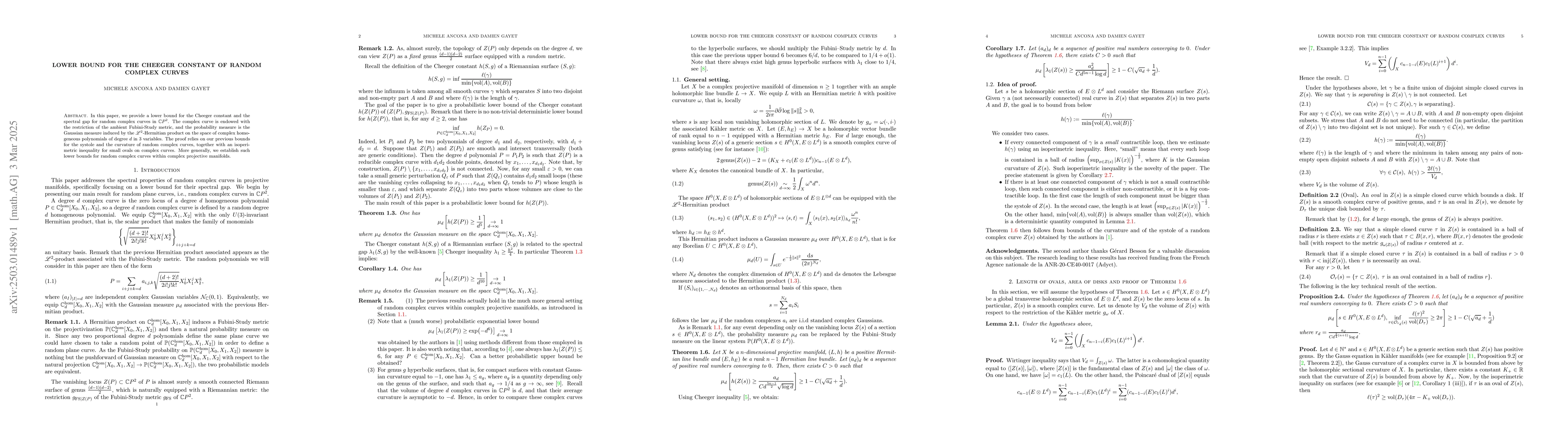The paper provides a lower bound for the Cheeger constant and spectral gap of random complex curves in $\C P^2$, using bounds for the systole and curvature of random complex curves, along with an isoperimetric inequality for small ovals on complex curves.