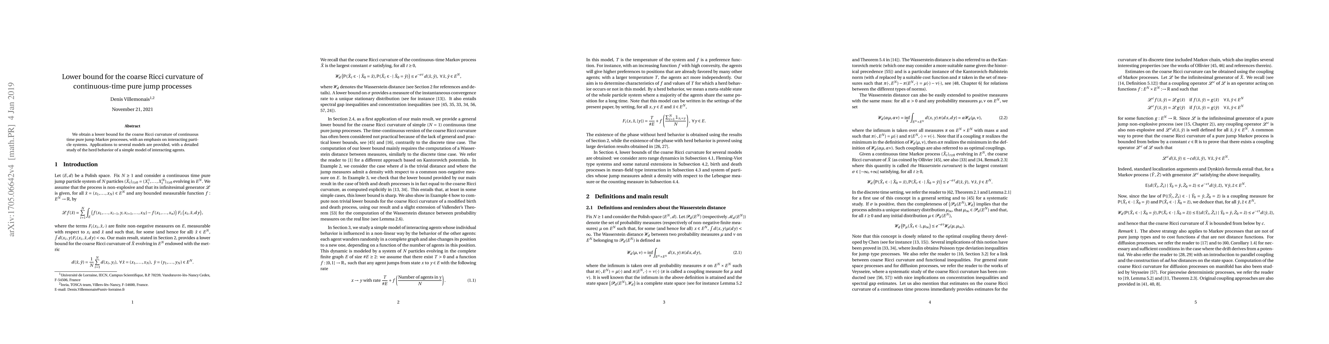 Summary: This paper establishes a lower bound for the coarse Ricci curvature of continuous-time pure jump Markov processes, particularly focusing on interacting particle systems, and applies the results to models demonstrating herd behavior in simple interacting agent systems.