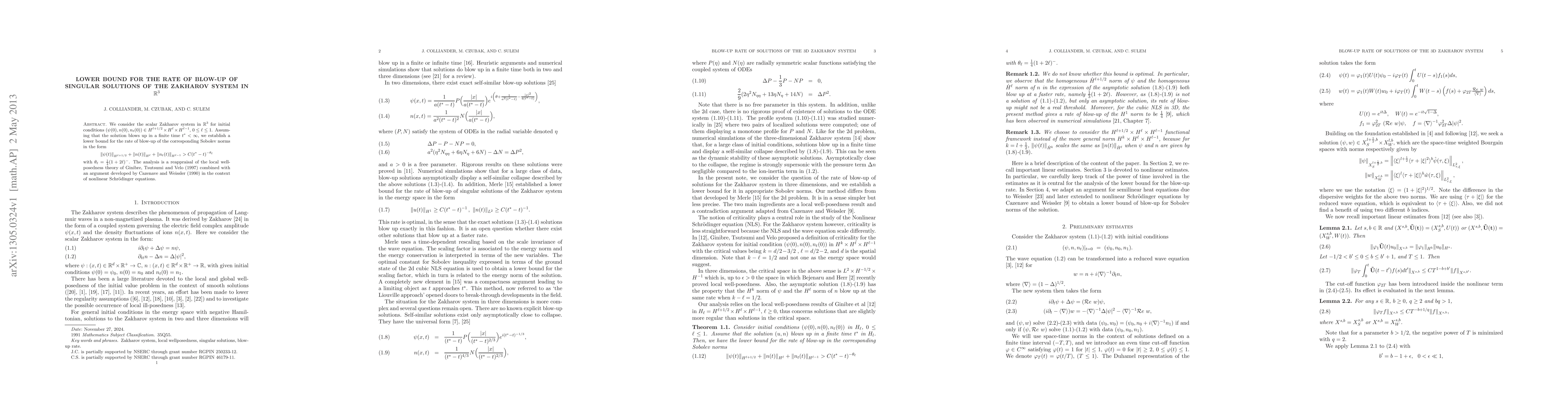 This paper establishes a lower bound for the rate of blow-up of singular solutions in the Zakharov system, showing that the Sobolev norms of the solution increase at a specific rate as it blows up.