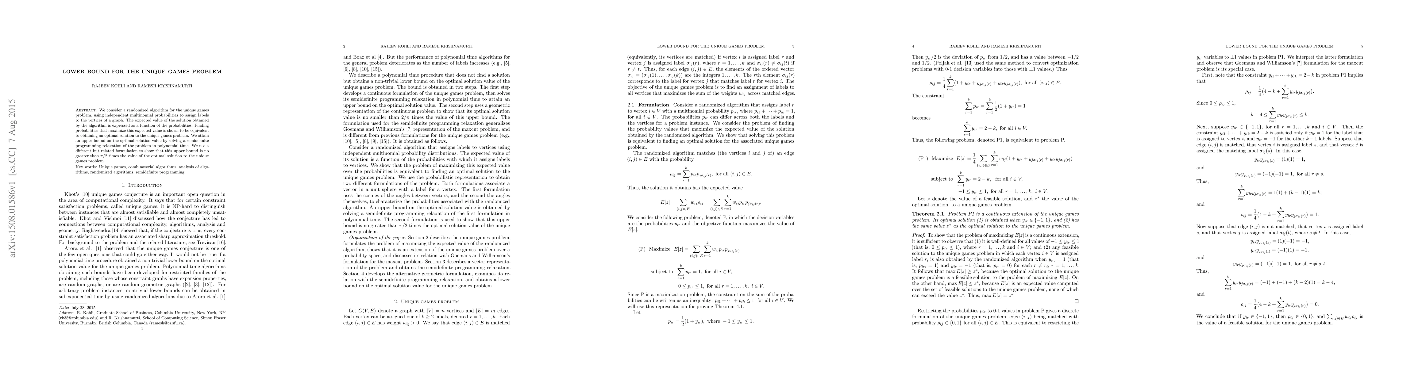 This paper explores a randomized algorithm for solving the unique games problem, demonstrating that maximizing the expected solution value through independent multinomial probabilities is equivalent to finding the optimal solution. An upper bound on this optimal value is derived via a semidefinite programming relaxation, which is shown to be no greater than π/2 times the optimal solution value.