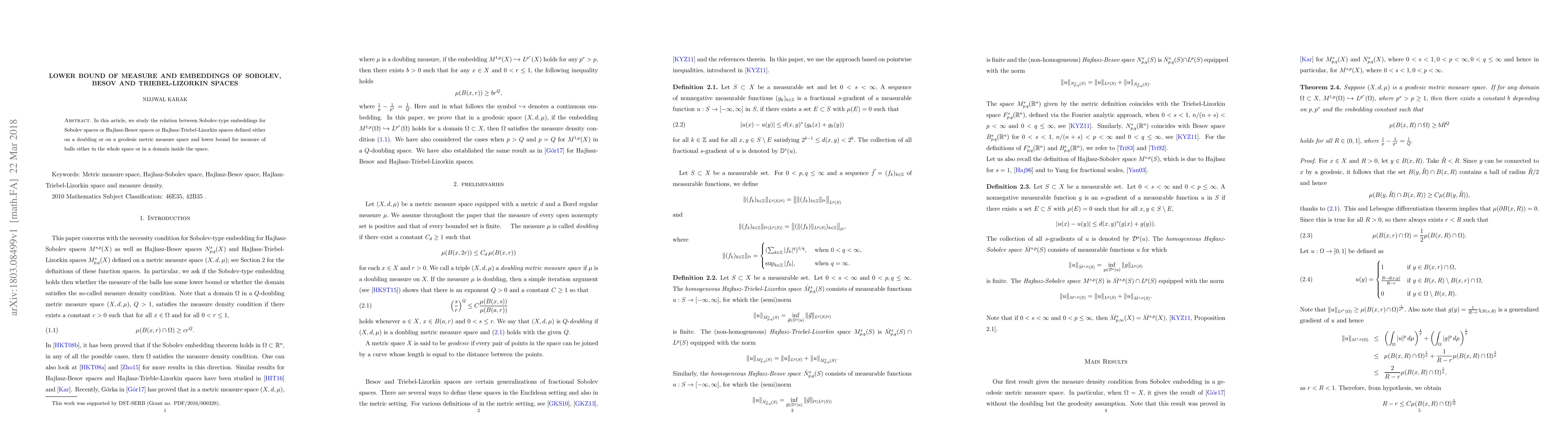 In this article, we study the relation between Sobolev-type embeddings for Sobolev spaces or Besov spaces or Triebel-Lizorkin spaces defined either on a doubling or on a geodesic metric measure space and lower bound for measure of balls either in the whole space or in a domain inside the space.