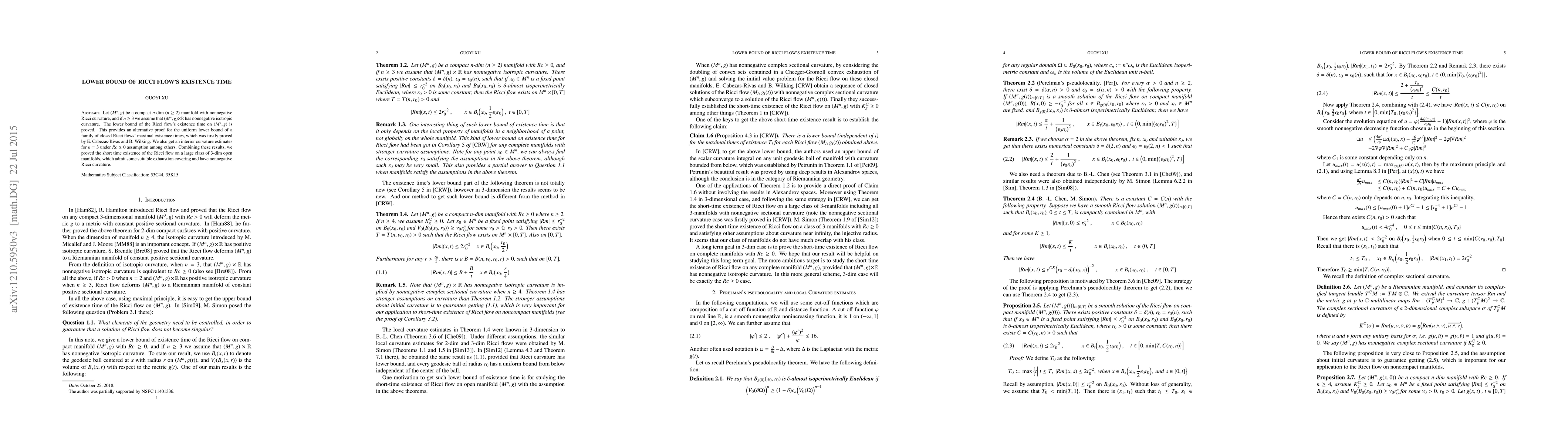 Let $(M^n, g)$ be a compact $n$-dim ($n\geq 2$) manifold with nonnegative Ricci curvature, and if $n\geq 3$ we assume that $(M^n, g)\times \mathbb{R}$ has nonnegative isotropic curvature. The lower bound of the Ricci flow's existence time on $(M^n, g)$ is proved. This provides an alternative proof for the uniform lower bound of a family of closed Ricci flows' maximal existence times, which was firstly proved by E. Cabezas-Rivas and B. Wilking. We also get an interior curvature estimates for $n= 3$ under $Rc\geq 0$ assumption among others. Combining these results, we proved the short time existence of the Ricci flow on a large class of $3$-dim open manifolds, which admit some suitable exhaustion covering and have nonnegative Ricci curvature.