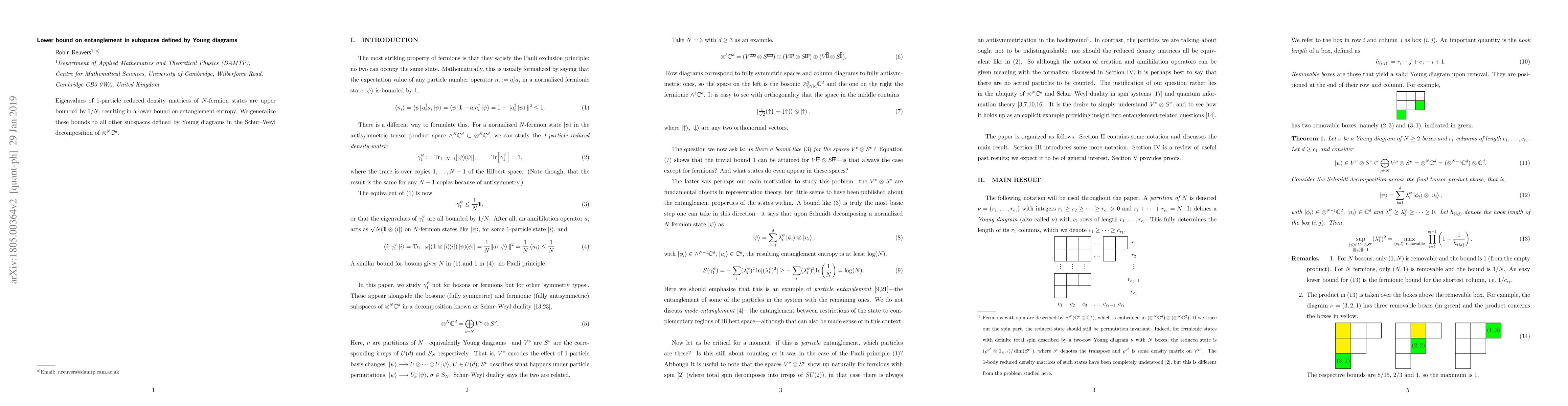 Eigenvalues of 1-particle reduced density matrices of $N$-fermion states are upper bounded by $1/N$, resulting in a lower bound on entanglement entropy. We generalize these bounds to all other subspaces defined by Young diagrams in the Schur-Weyl decomposition of $\otimes^N\mathbb{C}^d$.