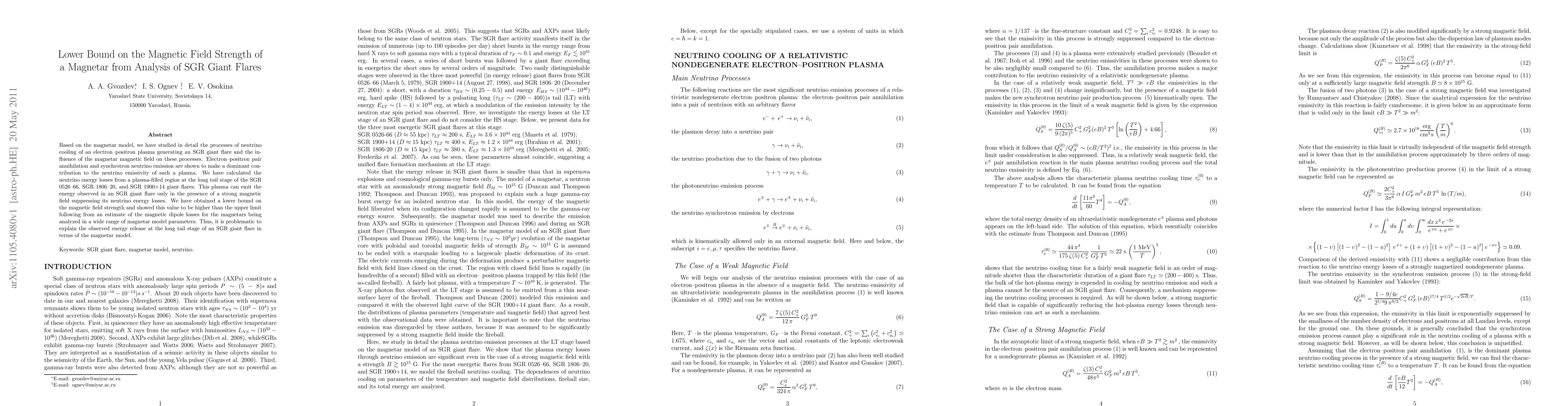 This paper investigates the processes of neutrino cooling in magnetars during SGR giant flares, finding that electron-positron pair annihilation and synchrotron neutrino emission are key contributors. It establishes a lower bound on the magnetic field strength required to suppress neutrino energy losses, which is higher than previously estimated limits, challenging the magnetar model's ability to explain observed energy releases.