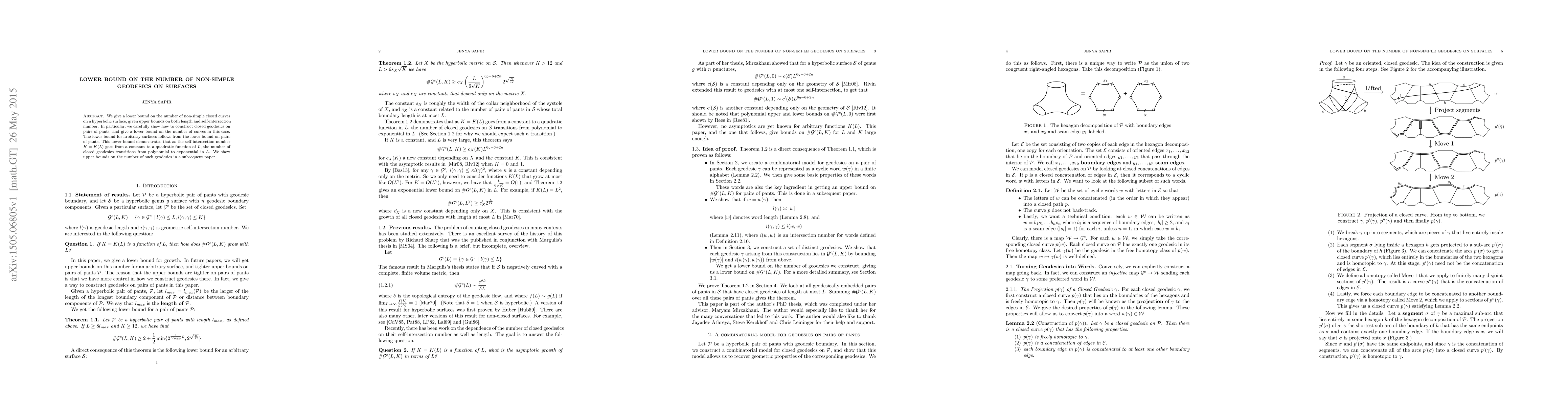We give a lower bound on the number of non-simple closed curves on a hyperbolic surface, given upper bounds on both length and self-intersection number. In particular, we carefully show how to construct closed geodesics on pairs of pants, and give a lower bound on the number of curves in this case. The lower bound for arbitrary surfaces follows from the lower bound on pairs of pants. This lower bound demonstrates that as the self-intersection number $K = K(L)$ goes from a constant to a quadratic function of $L$, the number of closed geodesics transitions from polynomial to exponential in $L$. We show upper bounds on the number of such geodesics in a subsequent paper.