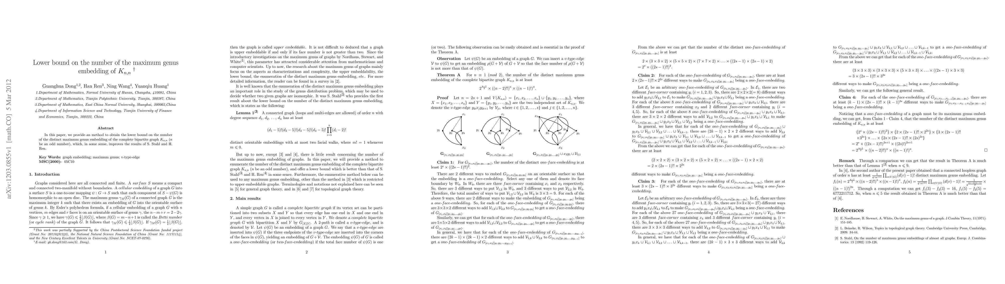 In this paper, we provide an method to obtain the lower bound on the number of the distinct maximum genus embedding of the complete bipartite graph Kn;n (n be an odd number), which, in some sense, improves the results of S. Stahl and H. Ren.