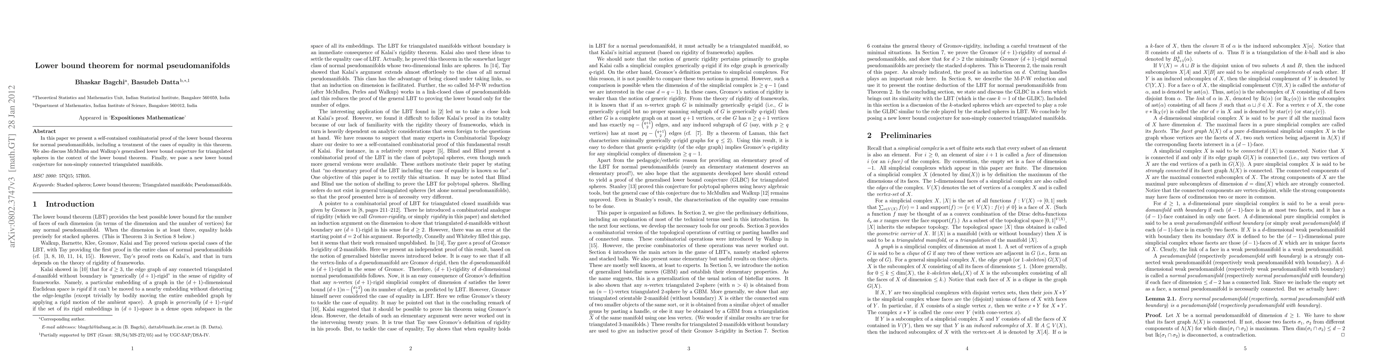 This paper provides a combinatorial proof of the lower bound theorem for normal pseudomanifolds and explores cases of equality. It also discusses McMullen and Walkup's generalized conjecture and proposes a new conjecture for non-simply connected triangulated manifolds.
