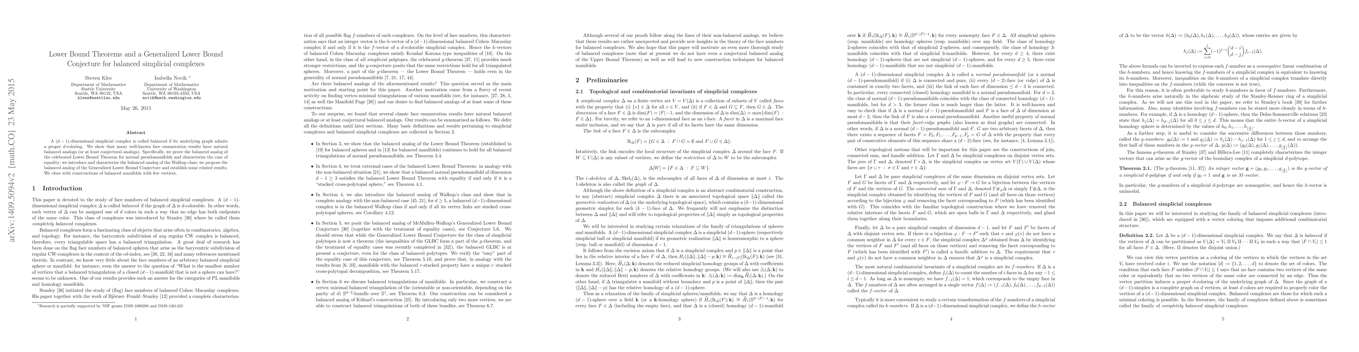 The paper proves the balanced analog of the Lower Bound Theorem for pseudomanifolds and introduces the balanced analog of the Generalized Lower Bound Conjecture for balanced simplicial complexes. It also provides constructions of balanced manifolds with few vertices.