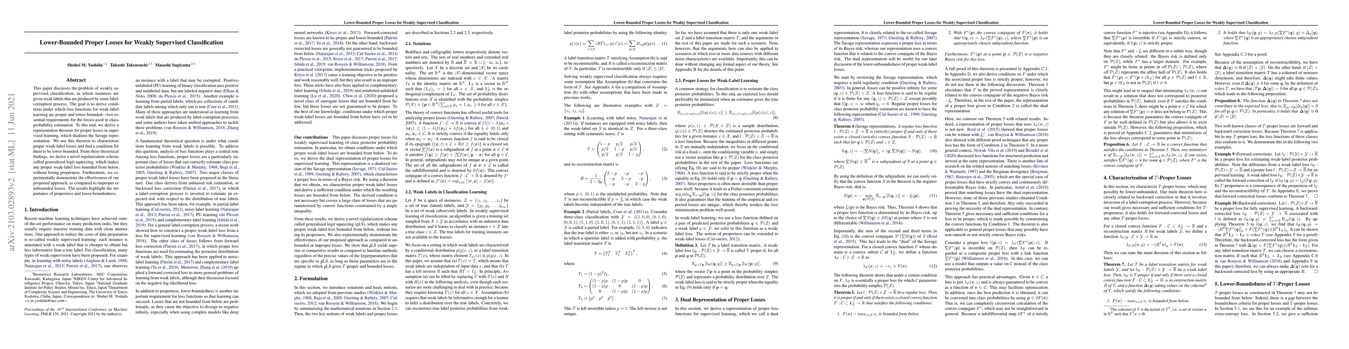 This paper discusses the problem of weakly supervised classification, in which instances are given weak labels that are produced by some label-corruption process. The goal is to derive conditions under which loss functions for weak-label learning are proper and lower-bounded -- two essential requirements for the losses used in class-probability estimation. To this end, we derive a representation theorem for proper losses in supervised learning, which dualizes the Savage representation. We use this theorem to characterize proper weak-label losses and find a condition for them to be lower-bounded. From these theoretical findings, we derive a novel regularization scheme called generalized logit squeezing, which makes any proper weak-label loss bounded from below, without losing properness. Furthermore, we experimentally demonstrate the effectiveness of our proposed approach, as compared to improper or unbounded losses. The results highlight the importance of properness and lower-boundedness.