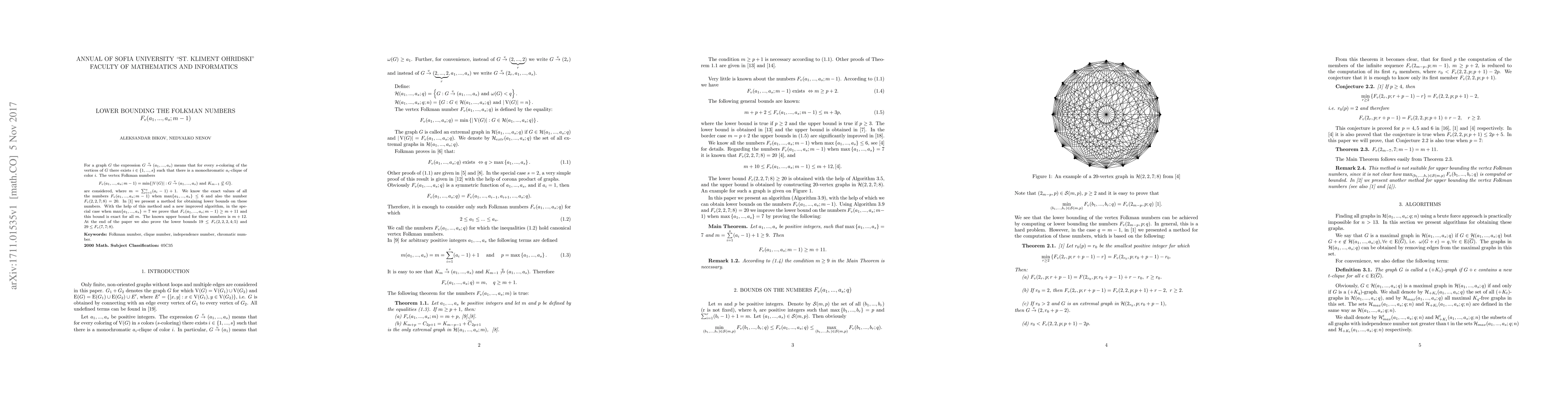 This paper investigates lower bounds for the vertex Folkman numbers $F_v(a_1, ..., a_s; m - 1)$, which represent the minimum number of vertices in a graph ensuring a monochromatic clique of certain sizes under vertex coloring. The authors improve upon previous methods to show that $F_v(a_1, ..., a_s; m - 1) \geq m + 11$ when $\max\{a_1, ..., a_s\} = 7$, and provide additional lower bounds for specific cases.