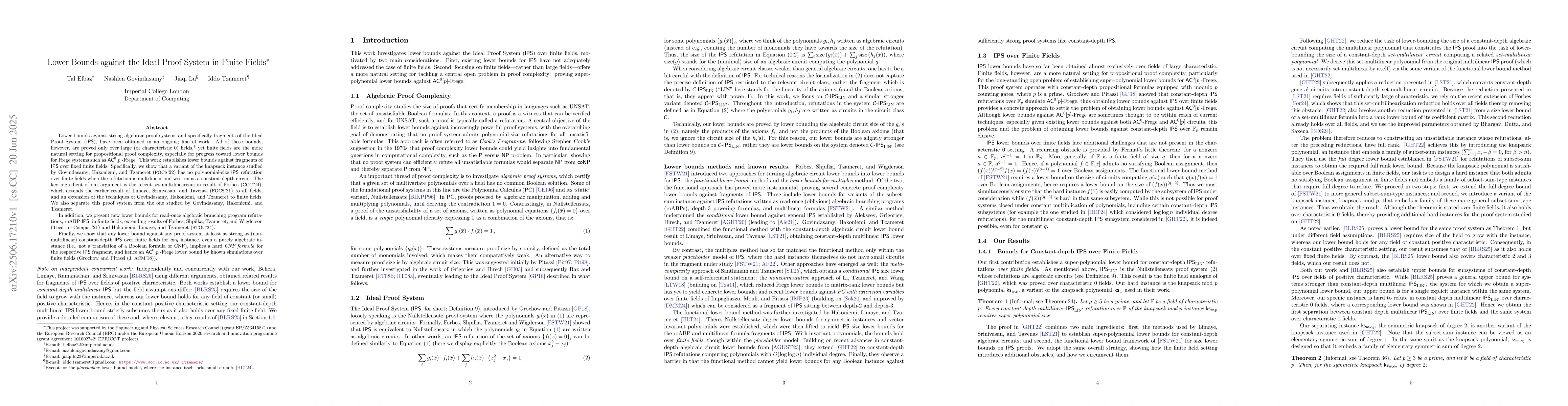 Lower bounds against strong algebraic proof systems and specifically fragments of the Ideal Proof System (IPS), have been obtained in an ongoing line of work. All of these bounds, however, are proved only over large (or characteristic $0$) fields, yet finite fields are the more natural setting for propositional proof complexity, especially for progress toward lower bounds for Frege systems such as $AC^0[p]$-Frege. This work establishes lower bounds against fragments of IPS over fixed finite fields. Specifically, we show that a variant of the knapsack instance studied by Govindasamy, Hakoniemi, and Tzameret (FOCS'22) has no polynomial-size IPS refutation over finite fields when the refutation is multilinear and written as a constant-depth circuit. The key ingredient of our argument is the recent set-multilinearization result of Forbes (CCC'24), which extends the earlier result of Limaye, Srinivasan, and Tavenas (FOCS'21) to all fields, and an extension of the techniques of Govindasamy, Hakoniemi, and Tzameret to finite fields. We also separate this proof system from the one studied by Govindasamy, Hakoniemi, and Tzameret. In addition, we present new lower bounds for read-once algebraic branching program refutations, roABP-IPS, in finite fields, extending results of Forbes, Shpilka, Tzameret, and Wigderson (Theor. of Comput.'21) and Hakoniemi, Limaye, and Tzameret (STOC'24). Finally, we show that any lower bound against any proof system at least as strong as (non-multilinear) constant-depth IPS over finite fields for any instance, even a purely algebraic instance (i.e., not a translation of a Boolean formula or CNF), implies a hard CNF formula for the respective IPS fragment, and hence an $AC^0[p]$-Frege lower bound by known simulations over finite fields (Grochow and Pitassi (J. ACM'18)).