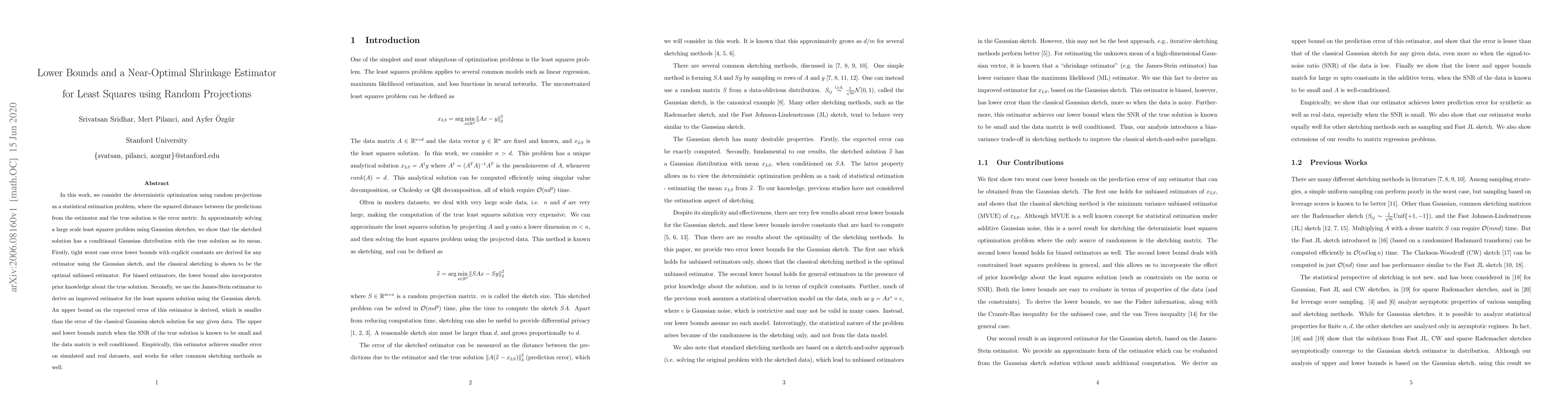 In this work, we consider the deterministic optimization using random projections as a statistical estimation problem, where the squared distance between the predictions from the estimator and the true solution is the error metric. In approximately solving a large scale least squares problem using Gaussian sketches, we show that the sketched solution has a conditional Gaussian distribution with the true solution as its mean. Firstly, tight worst case error lower bounds with explicit constants are derived for any estimator using the Gaussian sketch, and the classical sketching is shown to be the optimal unbiased estimator. For biased estimators, the lower bound also incorporates prior knowledge about the true solution. Secondly, we use the James-Stein estimator to derive an improved estimator for the least squares solution using the Gaussian sketch. An upper bound on the expected error of this estimator is derived, which is smaller than the error of the classical Gaussian sketch solution for any given data. The upper and lower bounds match when the SNR of the true solution is known to be small and the data matrix is well conditioned. Empirically, this estimator achieves smaller error on simulated and real datasets, and works for other common sketching methods as well.