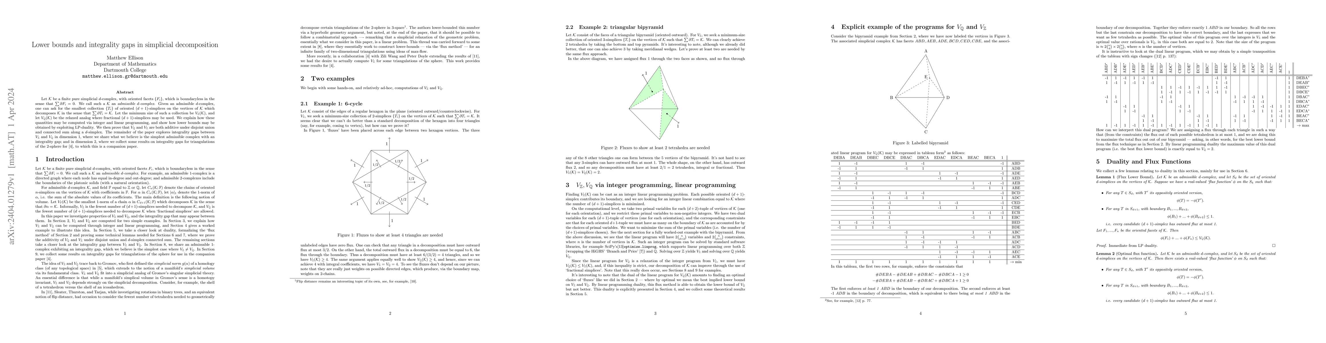 This paper explores lower bounds and integrality gaps in simplicial decomposition, focusing on admissible $d$-complexes and the minimum collections of $(d+1)$-simplices required to decompose them. It demonstrates the computation of these quantities through integer and linear programming, and highlights the simplest known complex with an integrality gap in dimensions 1 and 2.