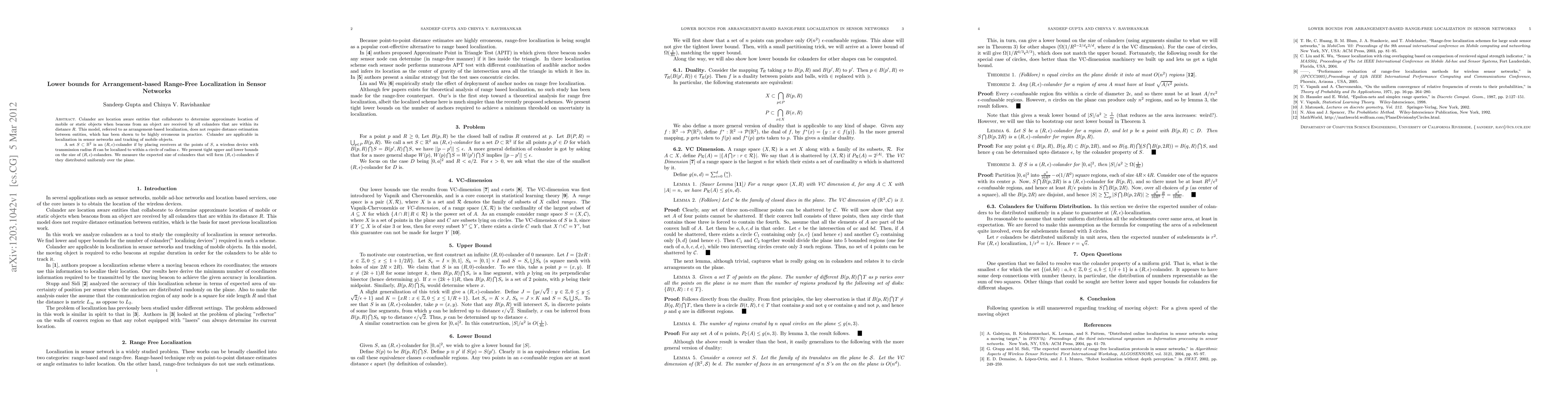 Colander are location aware entities that collaborate to determine approximate location of mobile or static objects when beacons from an object are received by all colanders that are within its distance $R$. This model, referred to as arrangement-based localization, does not require distance estimation between entities, which has been shown to be highly erroneous in practice. Colander are applicable in localization in sensor networks and tracking of mobile objects. A set $S \subset {\mathbb R}^2$ is an $(R,\epsilon)$-colander if by placing receivers at the points of $S$, a wireless device with transmission radius $R$ can be localized to within a circle of radius $\epsilon$. We present tight upper and lower bounds on the size of $(R,\epsilon)$-colanders. We measure the expected size of colanders that will form $(R, \epsilon)$-colanders if they distributed uniformly over the plane.