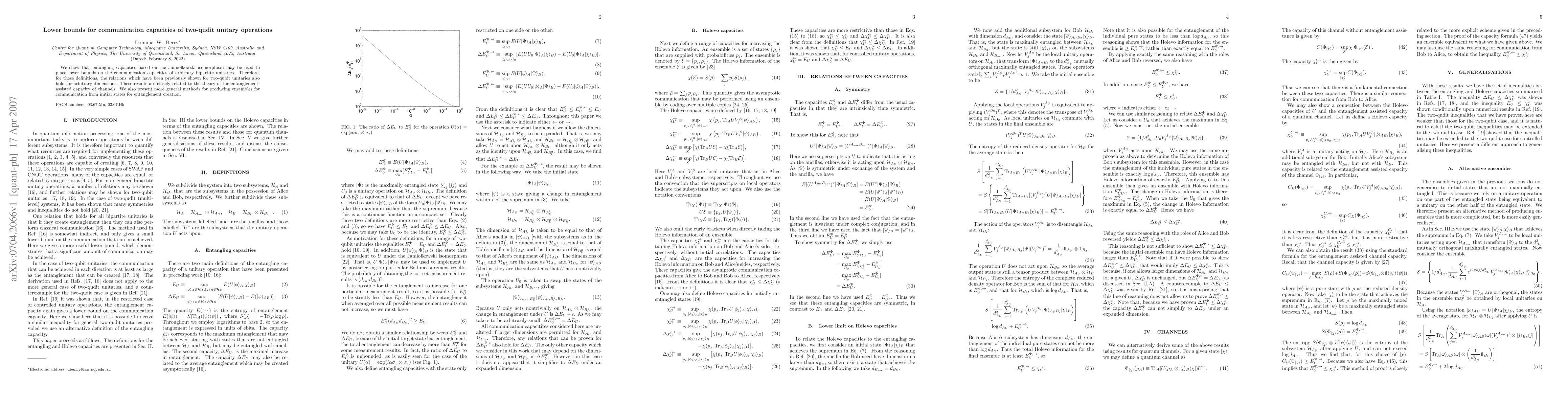 We show that entangling capacities based on the Jamiolkowski isomorphism may be used to place lower bounds on the communication capacities of arbitrary bipartite unitaries. Therefore, for these definitions, the relations which have been previously shown for two-qubit unitaries also hold for arbitrary dimensions. These results are closely related to the theory of the entanglement-assisted capacity of channels. We also present more general methods for producing ensembles for communication from initial states for entanglement creation.