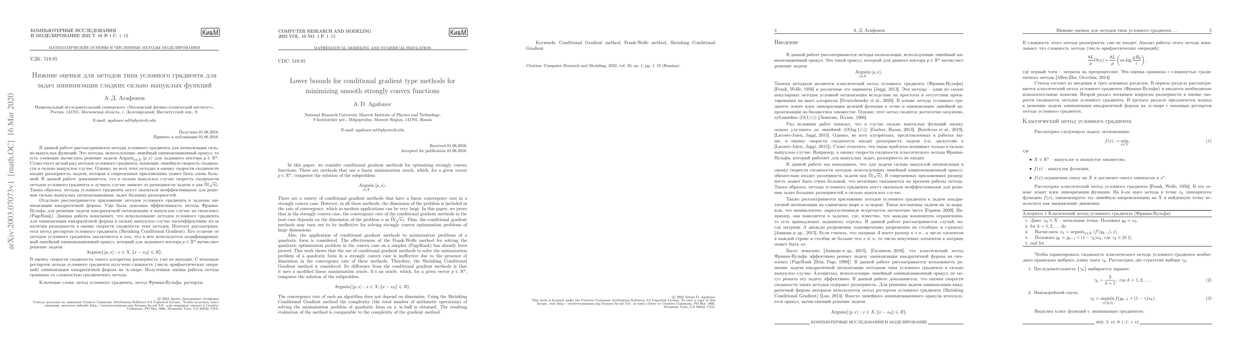 In this paper, we consider conditional gradient methods. These are methods that use a linear minimization oracle, which, for a given vector $p \in \mathbb{R}^n$, computes the solution of the subproblem $$\arg \min_{x\in X}{\langle p,x \rangle}.$$ There are a variety of conditional gradient methods that have a linear convergence rate in a strongly convex case. However, in all these methods, the dimension of the problem is included in the rate of convergence, which in modern applications can be very large. In this paper, we prove that in the strongly convex case, the convergence rate of the conditional gradient methods in the best case depends on the dimension of the problem $ n $ as $ \widetilde {\Omega} (\sqrt {n}) $. Thus, the conditional gradient methods may turn out to be ineffective for solving strongly convex optimization problems of large dimensions. Also, the application of conditional gradient methods to minimization problems of a quadratic form is considered. The effectiveness of the Frank-Wolfe method for solving the quadratic optimization problem in the convex case on a simplex (PageRank) has already been proved. This work shows that the use of conditional gradient methods to solve the minimization problem of a quadratic form in a strongly convex case is ineffective due to the presence of dimension in the convergence rate of these methods. Therefore, the Shrinking Conditional Gradient method is considered. Its difference from the conditional gradient methods is that it uses a modified linear minimization oracle. The convergence rate of such an algorithm does not depend on dimension. Using the Shrinking Conditional Gradient method the complexity of solving the minimization problem of quadratic form on a $ \infty $-ball is obtained. The resulting evaluation of the method is comparable to the complexity of the gradient method.