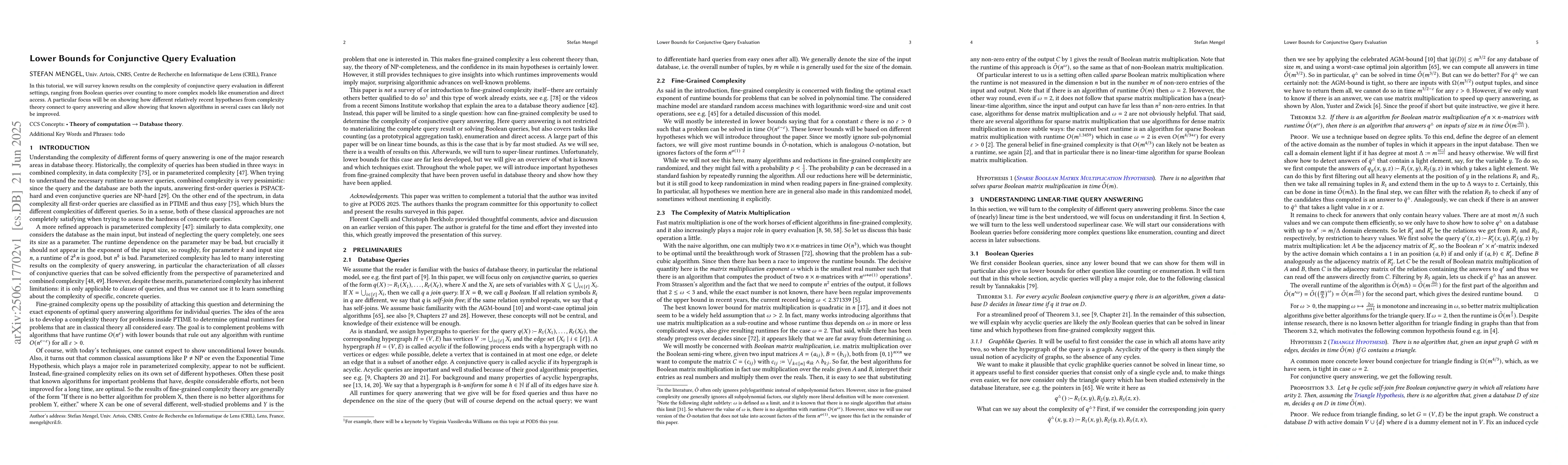 In this tutorial, we will survey known results on the complexity of conjunctive query evaluation in different settings, ranging from Boolean queries over counting to more complex models like enumeration and direct access. A particular focus will be on showing how different relatively recent hypotheses from complexity theory connect to query answering and allow showing that known algorithms in several cases can likely not be improved.