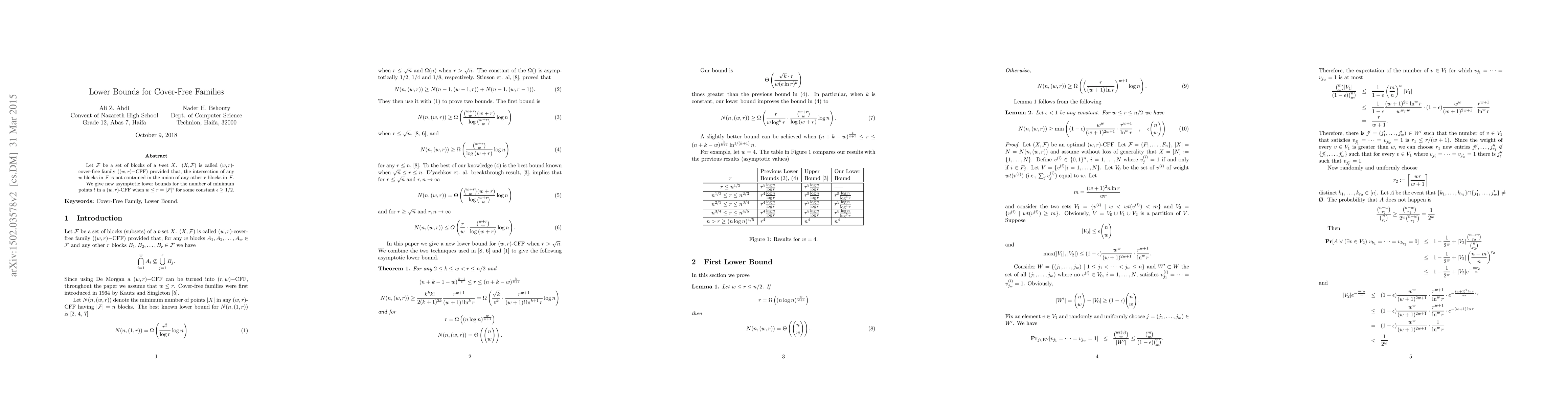 Let ${\cal F}$ be a set of blocks of a $t$-set $X$. $(X,{\cal F})$ is called $(w,r)$-cover-free family ($(w,r)-$CFF) provided that, the intersection of any $w$ blocks in ${\cal F}$ is not contained in the union of any other $r$ blocks in ${\cal F}$. We give new asymptotic lower bounds for the number of minimum points $t$ in a $(w,r)$-CFF when $w\le r=|{\cal F}|^\epsilon$ for some constant $\epsilon\ge 1/2$.