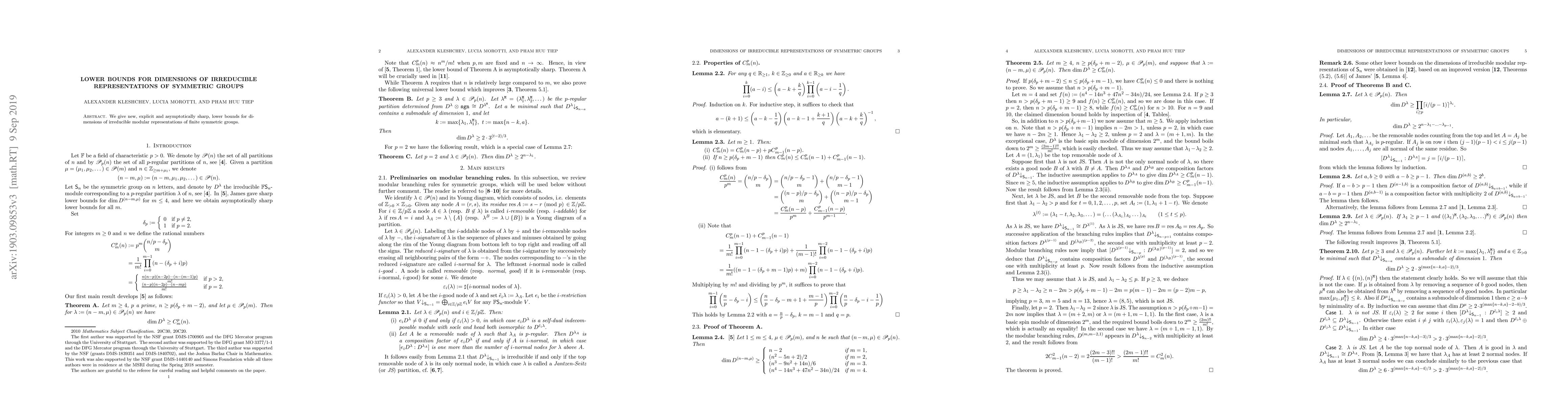 Summary: This paper presents new, explicit, and asymptotically sharp lower bounds for the dimensions of irreducible modular representations of finite symmetric groups. The results provide significant improvements over previous estimates.