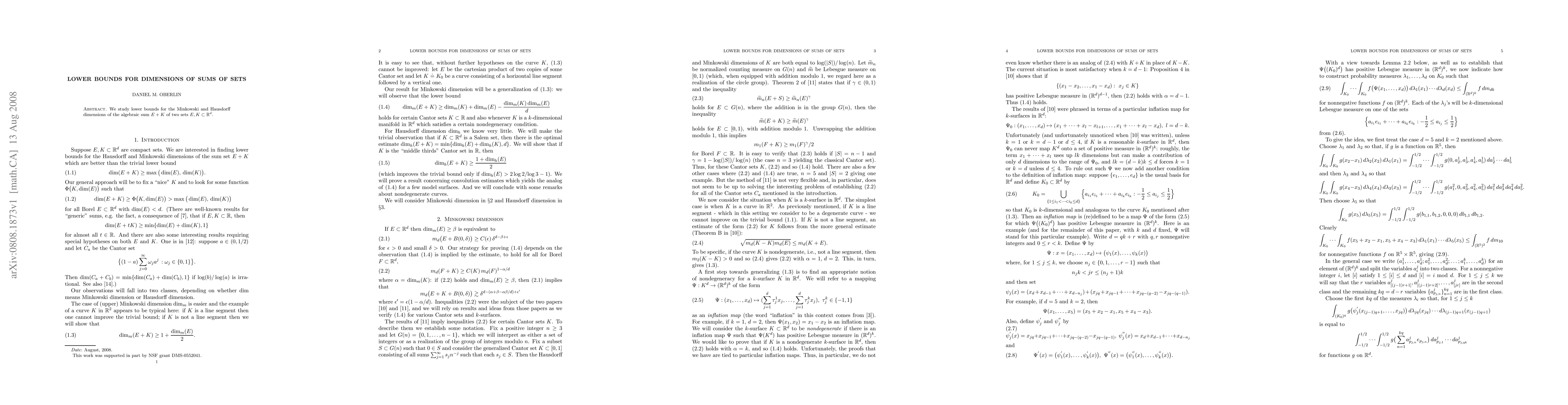 We study lower bounds for the Minkowski and Hausdorff dimensions of the algebraic sum E+K of two subsets E and K of d-dimensional Euclidean space.