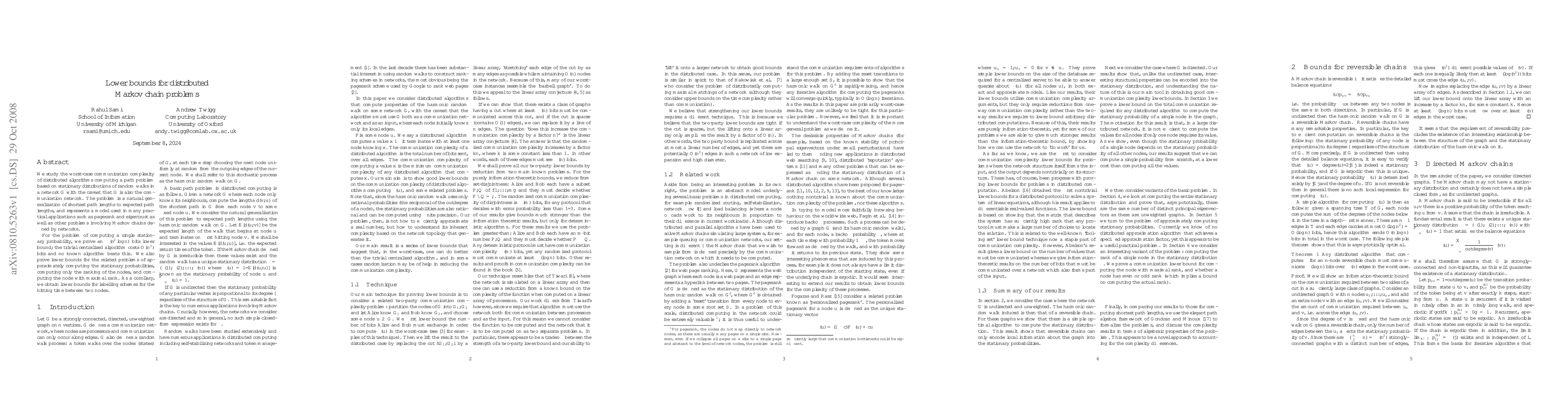 We study the worst-case communication complexity of distributed algorithms computing a path problem based on stationary distributions of random walks in a network $G$ with the caveat that $G$ is also the communication network. The problem is a natural generalization of shortest path lengths to expected path lengths, and represents a model used in many practical applications such as pagerank and eigentrust as well as other problems involving Markov chains defined by networks. For the problem of computing a single stationary probability, we prove an $\Omega(n^2 \log n)$ bits lower bound; the trivial centralized algorithm costs $O(n^3)$ bits and no known algorithm beats this. We also prove lower bounds for the related problems of approximately computing the stationary probabilities, computing only the ranking of the nodes, and computing the node with maximal rank. As a corollary, we obtain lower bounds for labelling schemes for the hitting time between two nodes.