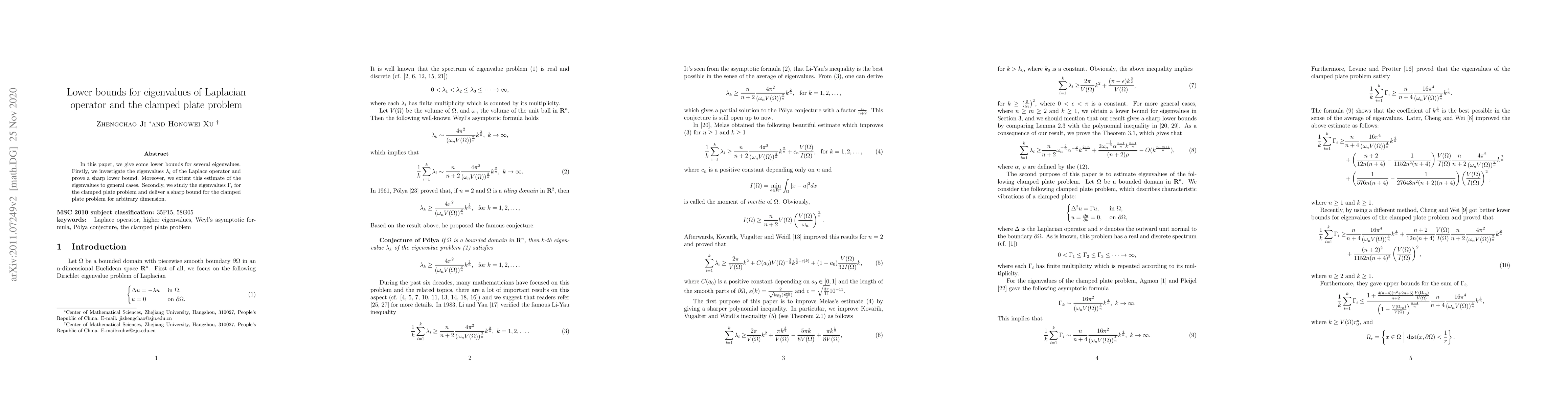 This paper establishes sharp lower bounds for the eigenvalues of the Laplace operator and extends these bounds to general cases. It also provides a sharp lower bound for the eigenvalues associated with the clamped plate problem across any dimension.