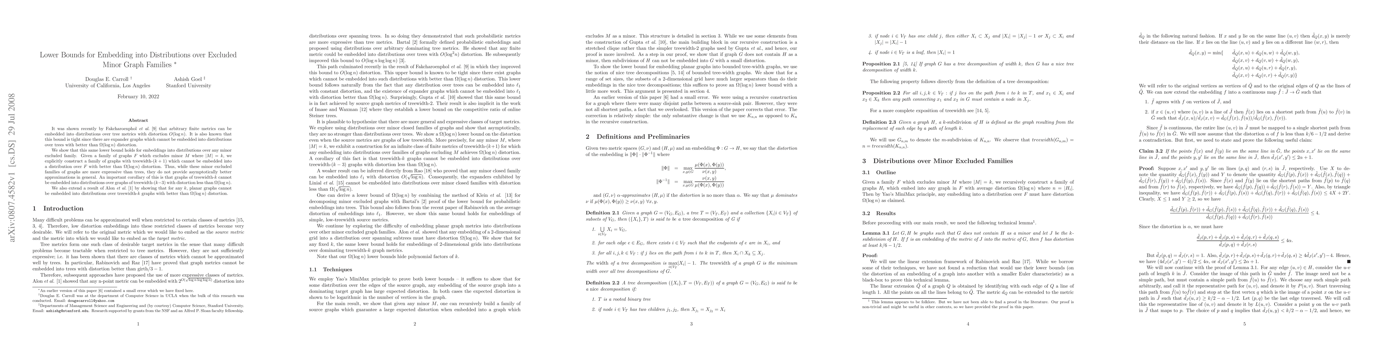 This paper establishes that embeddings into distributions over minor excluded graph families cannot achieve better than Omega(log n) distortion, mirroring the lower bound for tree metrics. It also proves that planar graphs cannot be embedded into distributions over treewidth-k graphs with better than Omega(log n) distortion.