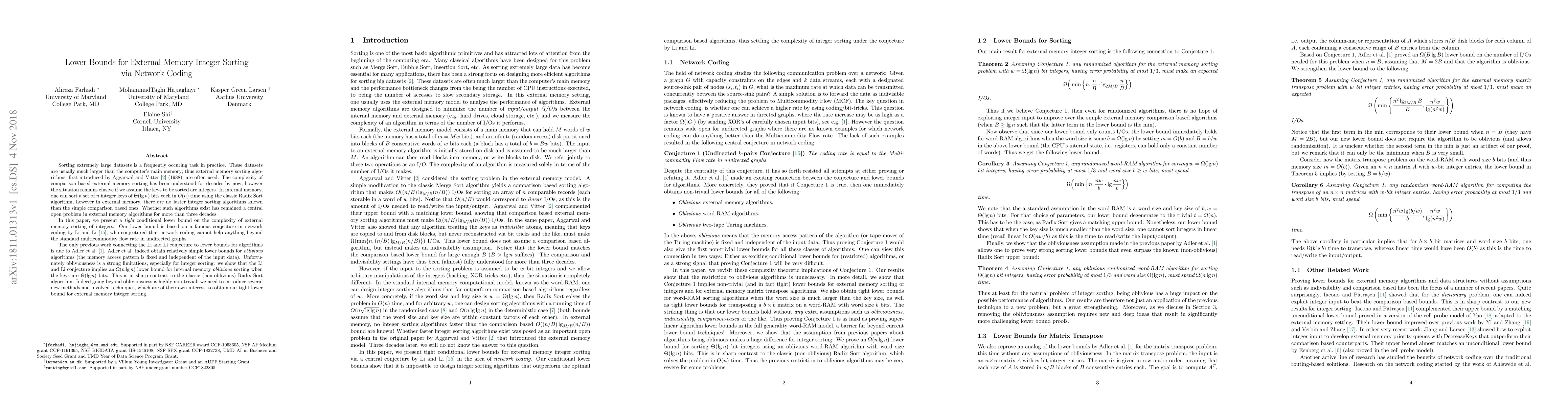 This paper establishes a tight conditional lower bound for external memory sorting of integers, leveraging the Li and Li conjecture in network coding. It demonstrates that achieving better-than-comparison-based sorting in external memory is unlikely, introducing new techniques to show an $\Omega(n \log n)$ lower bound for integer sorting.