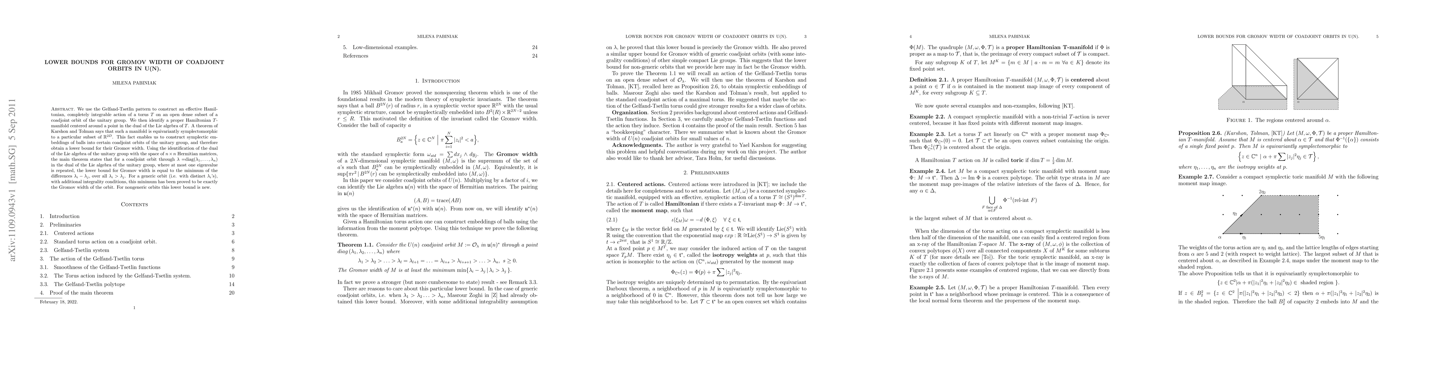 We use the Gelfand-Tsetlin pattern to construct an effective Hamiltonian, completely integrable action of a torus T on an open dense subset of a coadjoint orbit of the unitary group. We then identify a proper Hamiltonian T-manifold centered around a point in the dual of the Lie algebra of T. A theorem of Karshon and Tolman says that such a manifold is equivariantly symplectomorphic to a particular subset of R^2D. This fact enables us to construct symplectic embeddings of balls into certain coadjoint orbits of the unitary group, and therefore obtain a lower bound for their Gromov width. Using the identification of the dual of the Lie algebra of the unitary group with the space of (n x n) Hermitian matrices, the main theorem states that for a coadjoint orbit through \lambda=diag(\lambda_1, ..., \lambda_n) in the dual of the Lie algebra of the unitary group, where at most one eigenvalue is repeated, the lower bound for Gromov width is equal to the minimum of the differences \lambda_i-\lambda_j, over all \lambda_i>\lambda_j. For a generic orbit (i.e. with distinct \lambda_i's), with additional integrality conditions, this minimum has been proved to be exactly the Gromov width of the orbit. For nongeneric orbits this lower bound is new.